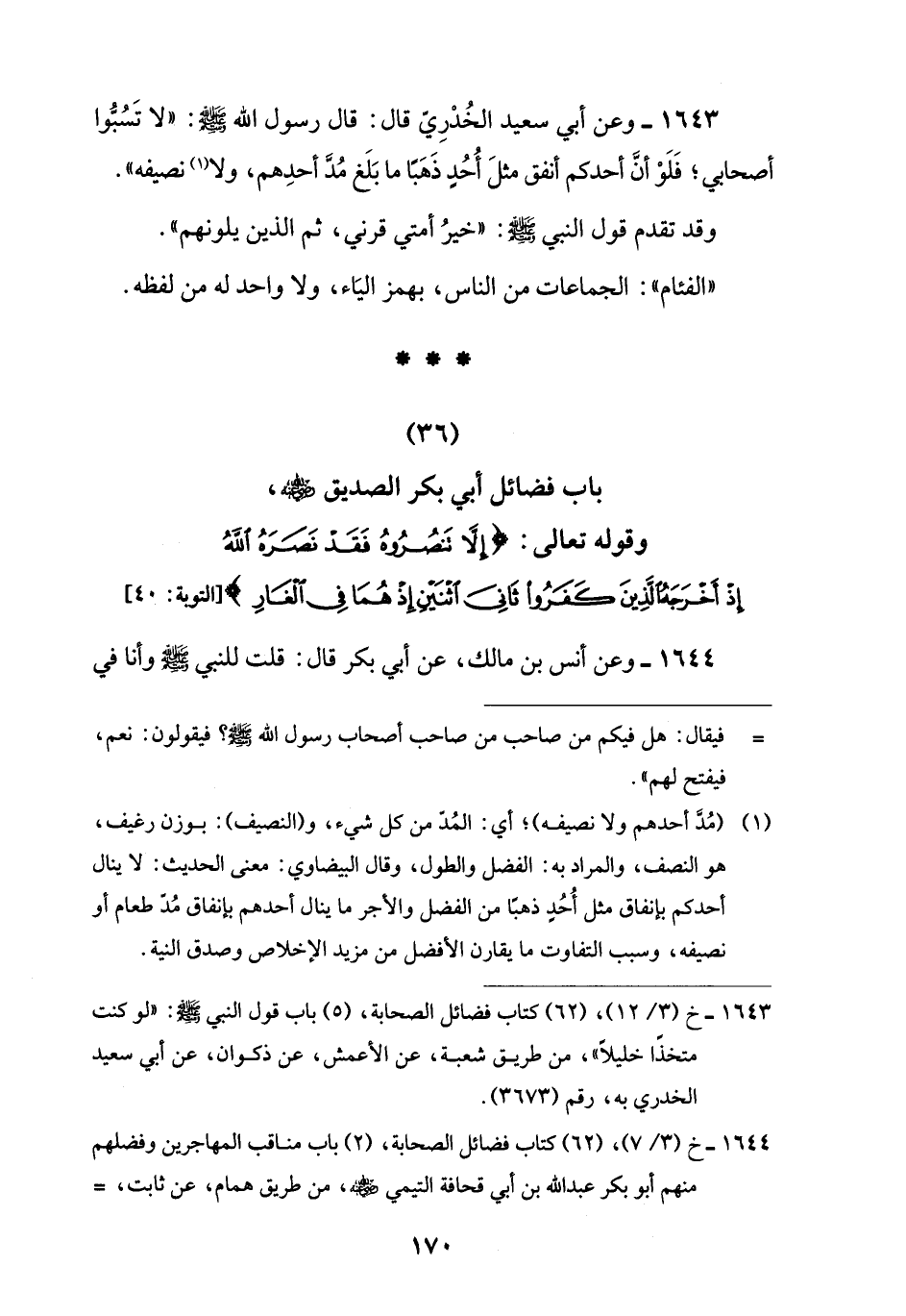 (36) باب فضائل أبي بكر الصديق -رضي اللَّه عنه-، وقوله تعالى: {إِلَّا تَنْصُرُوهُ فَقَدْ نَصَرَهُ اللَّهُ إِذْ أَخْرَجَهُ الَّذِينَ كَفَرُوا ثَانِيَ اثْنَيْنِ إِذْ هُمَا فِي الْغَارِ} [التوبة: 40]