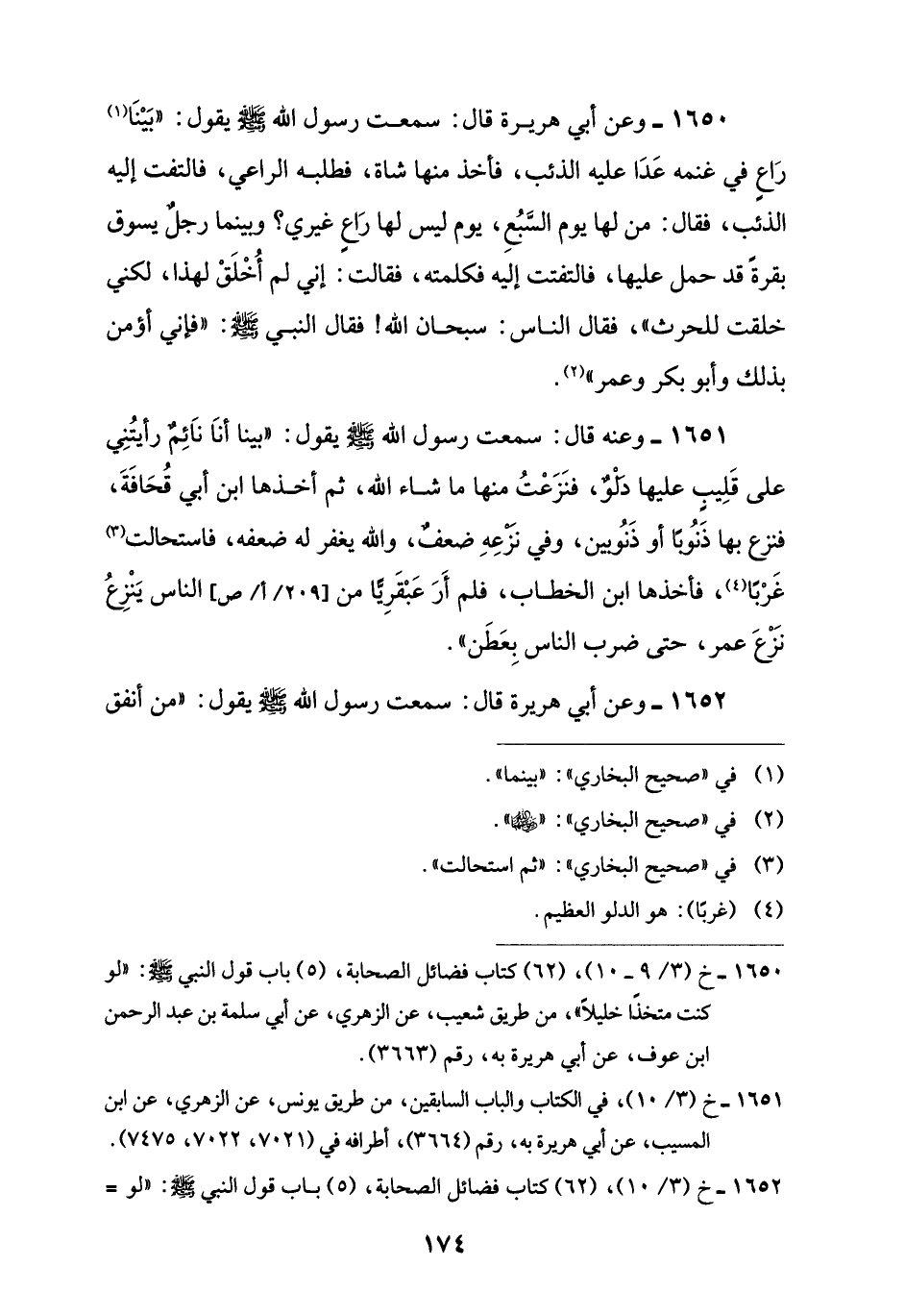 1650 - وعن أبي هريرة قال: سمعت رسول اللَّه -صلى اللَّه عليه وسلم- يقول: "بَيْنَا (¬1) رَاعٍ في غنمه عَدَا عليه الذئب، فأخذ منها شاة، فطلبه الراعي، فالتفت إليه الذئب، فقال: من لها يوم السَّبُعِ، يوم ليس لها رَاعٍ غيري؟ وبينما رجلٌ يسوق بقرةً قد حمل عليها، فالتفتت إليه فكلمته، فقالت: إني لم أُخْلَقْ لهذا، لكني خلقت للحرث"، فقال الناس: سبحان اللَّه! فقال النبي -صلى اللَّه عليه وسلم-: "فإني أؤمن بذلك وأبو بكر وعمر" (¬2).