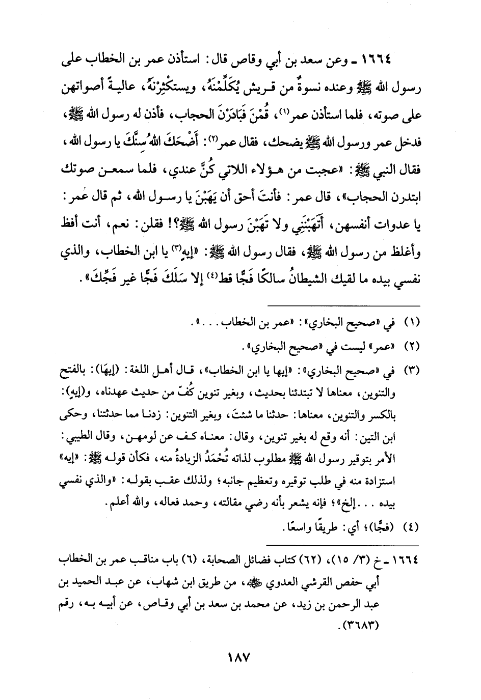 1664 - وعن سعد بن أبي وقاص قال: استأذن عمر بن الخطاب على رسول اللَّه -صلى اللَّه عليه وسلم- وعنده نسوةٌ من قريش يُكَلِّمْنَهُ، ويستكْثِرْنَهُ، عاليةً أصواتهن على صوته، فلما استأذن عمر (¬1)، قُمْنَ فَبَادَرْنَ الحجاب، فأذن له رسول اللَّه -صلى اللَّه عليه وسلم-، فدخل عمر ورسول اللَّه -صلى اللَّه عليه وسلم- يضحك، فقال عمر (¬2): أَضْحَكَ اللَّهُ سِنَّكَ يا رسول اللَّه، فقال النبي -صلى اللَّه عليه وسلم-: "عجبت من هؤلاء اللاتي كُنَّ عندي، فلما سمعن صوتك ابتدرن الحجاب"، قال عمر: فأنتَ أحق أن يَهَبْنَ يا رسول اللَّه، ثم قال عمر: يا عدوات أنفسهن، أَتَهَبْنَنِي ولا تَهَبْنَ رسول اللَّه -صلى اللَّه عليه وسلم-؟ ! فقلن: نعم، أنت أفظ وأغلظ من رسول اللَّه -صلى اللَّه عليه وسلم-، فقال رسول اللَّه -صلى اللَّه عليه وسلم-: "إيهٍ (¬3) يا ابن الخطاب، والذي نفسي بيده ما لقيك الشيطانُ سالكًا فَجًّا قط (¬4) إلا سَلَكَ فَجًّا غير فَجِّكَ".