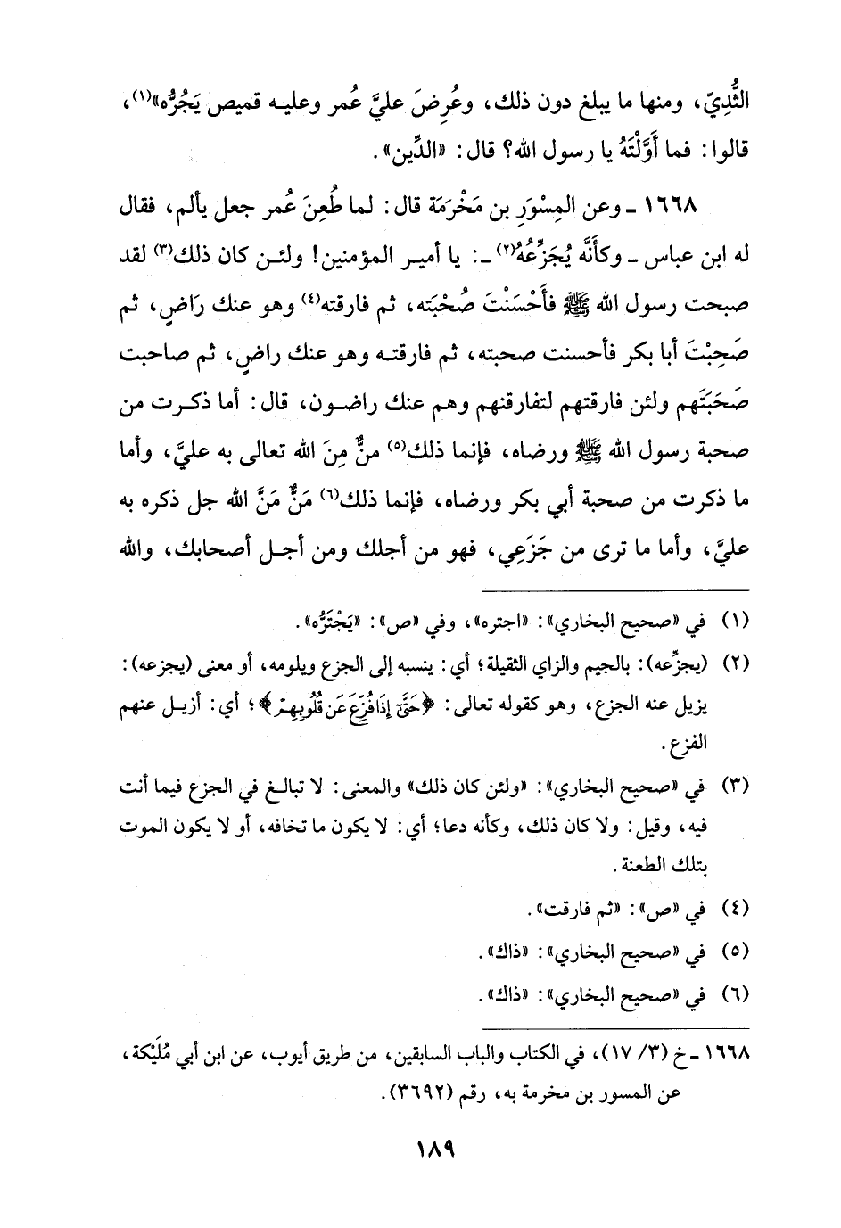 1668 - وعن المِسْوَرِ بن مَخْرَمَة قال: لما طُعِنَ عُمر جعل يألم، فقال له ابن عباس -وكأَنَّه يُجَزِّعُهُ (¬2) -: يا أمير المؤمنين! ولئن كان ذلك (¬3) لقد صبحت رسول اللَّه -صلى اللَّه عليه وسلم- فأحْسَنْتَ صُحْبَته، ثم فارقته (¬4) وهو عنك رَاضٍ، ثم صَحِبْتَ أبا بكر فأحسنت صحبته، ثم فارقته وهو عنك راضٍ، ثم صاحبت صَحَبَتَهم ولئن فارقتهم لتفارقنهم وهم عنك راضون، قال: أما ذكرت من صحبة رسول اللَّه -صلى اللَّه عليه وسلم- ورضاه، فإنما ذلك (¬5) مَنٌّ مِنَ اللَّه تعالى به عليَّ، وأما ما ذكرت من صحبة أبي بكر ورضاه، فإنما ذلك (¬6) مَنٌّ مَنَّ اللَّه جل ذكره به عليَّ، وأما ما ترى من جَزَعِي، فهو من أجلك ومن أجل أصحابك، واللَّه