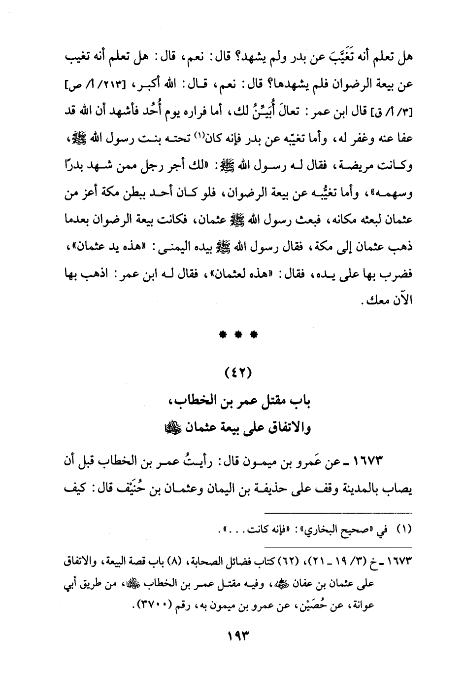 1673 - خ (3/ 19 - 21)، (62) كتاب فضائل الصحابة، (8) باب قصة البيعة، والاتفاق على عثمان بن عفان -رضي اللَّه عنه-، وفيه مقتل عمر بن الخطاب -رضي اللَّه عنهما-، من طريق أبي عوانة، عن حُصَيْن، عن عمرو بن ميمون به، رقم (3700).