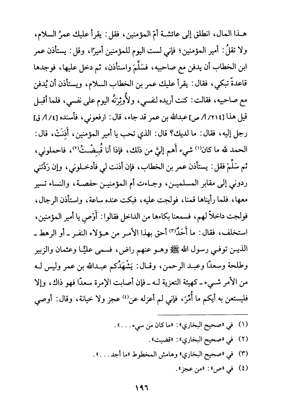 هذا المال، انطلق إلى عائشة أمّ المؤمنين، فقل: يقرأ عليك عمرُ السلام، ولا تقلُ: أمير المؤمنين؛ فإني لست اليوم للمؤمنين أميرًا، وقل: يستأذن عمر ابن الخطاب أن يدفن مع صاحبيه، فسَلَّمَ واستأذن، ثم دخل عليها، فوجدها قاعدةً تبكي، فقال: يقرأ عليك عمر بن الخطاب السلام، ويستأذن أن يُدفن مع صاحبيه، فقالت: كنت أريده لنفسي، ولأُوثِرَنَّه اليوم على نفسي، فلما أقبل قيل هذا عبد اللَّه بن عمر قد جاء، قال: ارفعوني، فأسنده رجل إليه، فقال: ما لديك؟ قال: الذي تحب يا أمير المؤمنين، أَذِنَتْ، قال: الحمد للَّه ما كان (¬1) شيء أَهم إليَّ من ذلك، فإذا أنا قُبِضْتُ (¬2)، فاحملوني، ثم سَلِّمْ فقل: يستأذن عمر بن الخطاب، فإن أذنت لي فأدخلوني، وإن رَدَّتني ردوني إلى مقابر المسلمين، وجاءت أم المؤمنين حفصة، والنساء تسير معها، فلما رأيناها قمنا، فولجت عليه، فبكت عنده ساعة، واستأذن الرجال، فولجت داخلًا لهم، فسمعنا بكاءها من الداخل فقالوا: أَوْصِ يا أمير المؤمنين، استخلف، فقال: ما أَحَدٌ (¬3) أحق بهذا الأمر من هؤلاء النفر -أو الرهط- الذين توفي رسول اللَّه -صلى اللَّه عليه وسلم- وهو عنهم راض، فسمى عليًّا وعثمان والزبير وطلحة وسعدًا وعبد الرحمن، وقال: يَشْهَدُكم عبد اللَّه بن عمر وليس له من الأمر شيء -كهيئة التعزية له- فإن أصابت الإمرة سعدًا فهو ذاك، وإلا فليستعن به أيكم ما أُمِّرَ، فإني لم أعزله عن (¬4) عجز ولا خيانة، وقال: أوصي