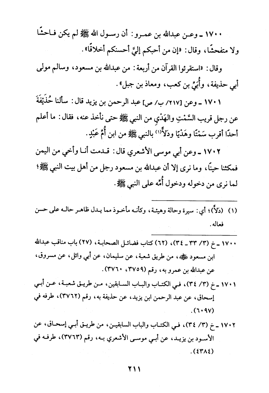 1700 - خ (3/ 33 - 34)، (62) كتاب فضائل الصحابة، (27) باب مناقب عبد اللَّه ابن مسعود -رضي اللَّه عنه-، من طريق شعبة، عن سليمان، عن أبي وائل، عن مسروق، عن عبد اللَّه بن عمرو به، رقم (3759، 3760).