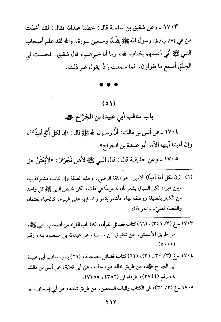 1704 - خ (3/ 30 - 31)، (62) كتاب فضائل الصحابة، (21) باب مناقب أبي عبيدة ابن الجراح -رضي اللَّه عنه-، من طريق خالد هو الحذاء، عن أبي قلابة، عن أنس بن مالك به، رقم (3744)، طرفاه في (4382، 7255).