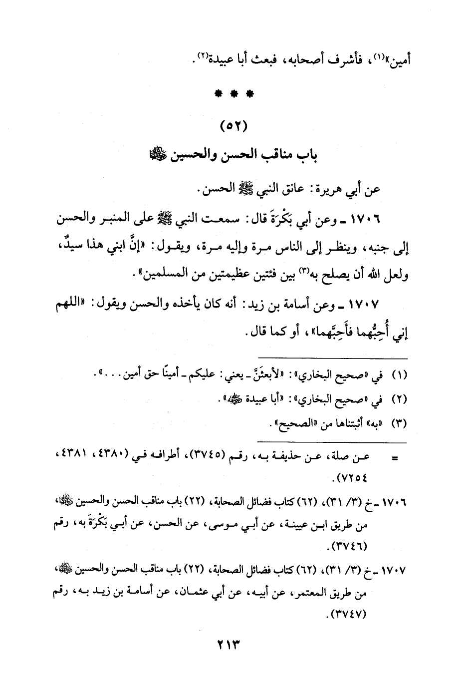 1707 - خ (3/ 31)، (62) كتاب فضائل الصحابة، (22) باب مناقب الحسن والحسين -رضي اللَّه عنهما-، من طريق المعتمر، عن أبيه، عن أبي عثمان، عن أسامة بن زيد به، رقم (3747).