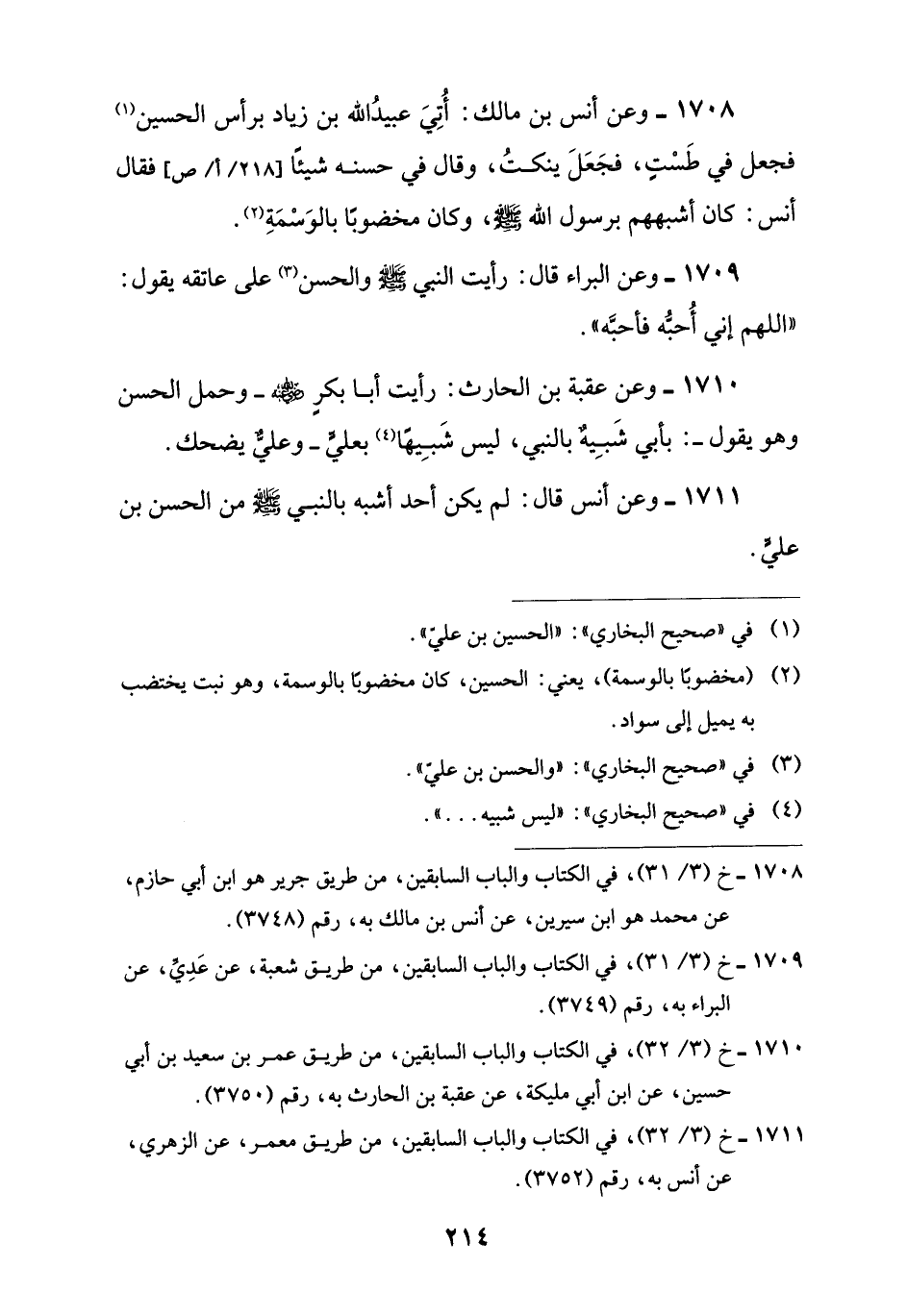 1708 - وعن أنس بن مالك: أُتِيَ عبيدُ اللَّه بن زياد برأس الحسين (¬1) فجعل في طَسْتٍ، فجَعَلَ ينكتُ، وقال في حسنه شيئًا فقال أنس: كان أشبههم برسول اللَّه -صلى اللَّه عليه وسلم-، وكان مخضوبًا بالوَسْمَةِ (¬2).