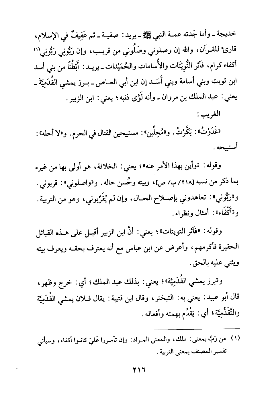 خديجة- وأما جَدته عمة النبي -صلى اللَّه عليه وسلم- يريد: صفية- ثم عَفِيفٌ في الإسلام، قارئ للقرآن، واللَّه إن وصلوني وصَلُوني من قريب، وإن رَبُّونِي رَبُّونِي (¬1) أكفاء كرام، فآثر التُّوِيْنَات والأُسامات والحُمَيْدات -يريد: أَبْطُنًا من بني أسد ابن تويت وبني أسامة وبني أَسَد إن ابن أبي العاص- برز يمشي القُدَمِيَّةَ -يعني: عبد الملك بن مروان- وأنه لَوَّى ذنبه؛ يعني: ابن الزبير.