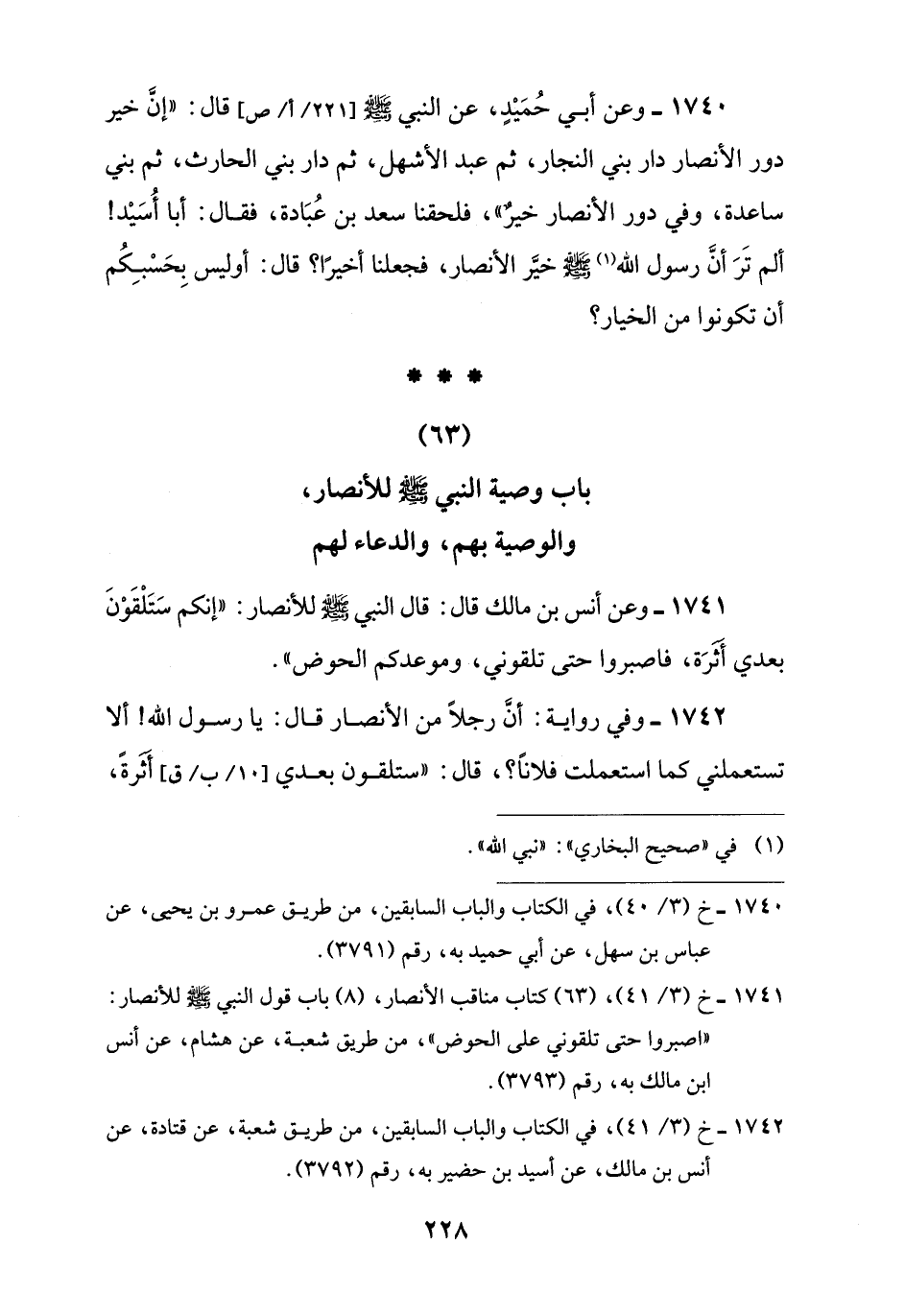 1741 - خ (3/ 41)، (63) كتاب مناقب الأنصار، (8) باب قول النبي -صلى اللَّه عليه وسلم- للأنصار: "اصبروا حتى تلقوني على الحوض"، من طريق شعبة، عن هشام، عن أنس ابن مالك به، رقم (3793).