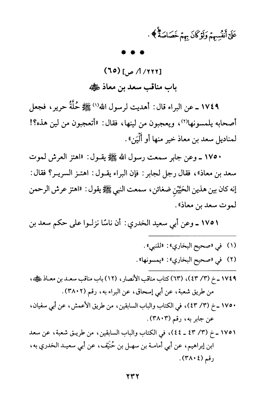 1749 - عن البراء قال: أهديت لرسول اللَّه (¬1) -صلى اللَّه عليه وسلم- حُلَّةُ حرير، فجعل أصحابه يلمسونها (¬2)، ويعجبون من لينها، فقال: "أتعجبون من لين هذه؟ ! لمناديل سعد بن معاذ خير منها أو أَلْيَن".