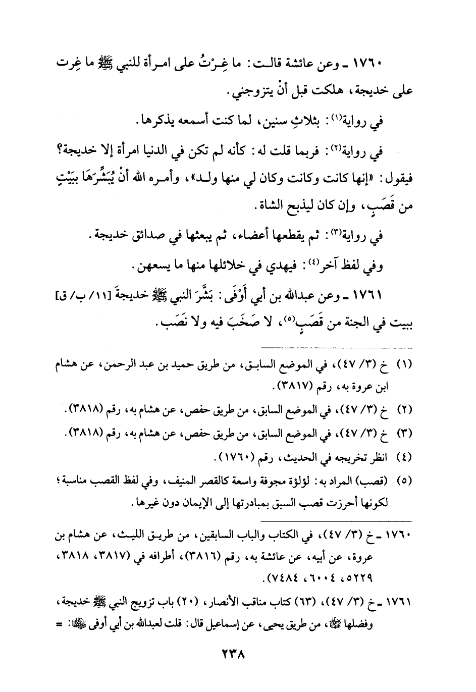 1761 - وعن عبد اللَّه بن أبي أَوْفَى: بَشَّرَ النبي -صلى اللَّه عليه وسلم- خديجةَ ببيت في الجنة من قَصَب (¬5)، لا صَخَبَ فيه ولا نصَب.