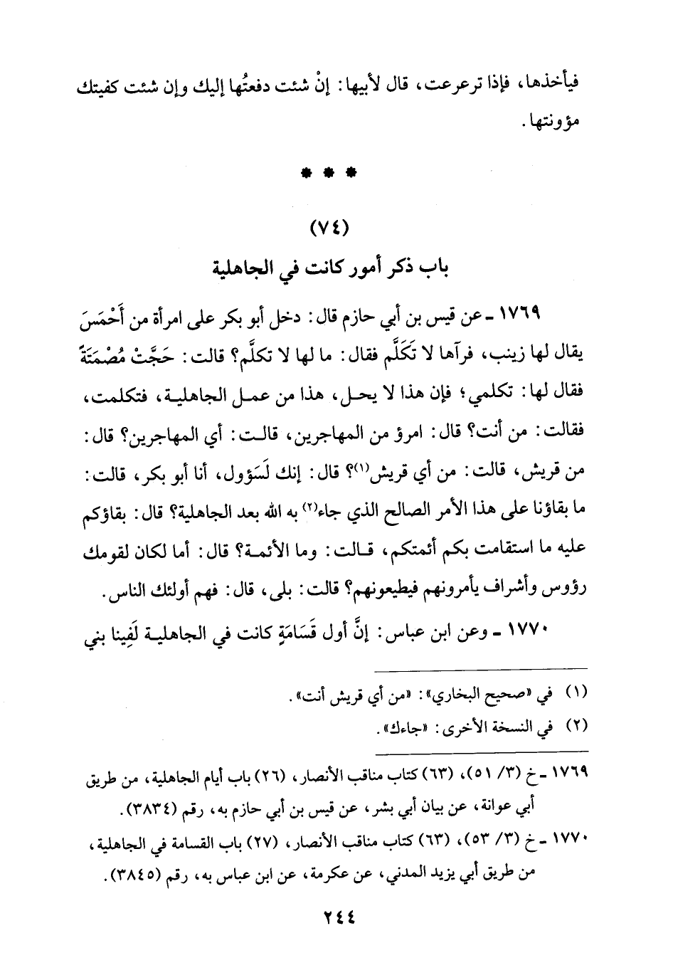 1769 - عن قيس بن أبي حازم قال: دخل أبو بكر على امرأة من أَحْمَسَ يقال لها زينب، فرَاها لا تَكَلَّم فقال: ما لها لا تكلَّم؟ قالت: حَجَّتْ مُصْمَتَةً فقال لها: تكلمي؛ فإن هذا لا يحل، هذا من عمل الجاهلية، فتكلمت، فقالت: من أنت؟ قال: امرؤ من المهاجرين، قالت: أي المهاجرين؟ قال: من قريش، قالت: من أي قريش (¬1)؟ قال: إنك لَسَؤول، أنا أبو بكر، قالت: ما بقاؤنا على هذا الأمر الصالح الذي جاء (¬2) به اللَّه بعد الجاهلية؟ قال: بقاؤكم عليه ما استقامت بكم أئمتكم، قالت: وما الأئمة؟ قال: أما لكان لقومك رؤوس وأشراف يأمرونهم فيطيعونهم؟ قالت: بلى، قال: فهم أولئك الناس.