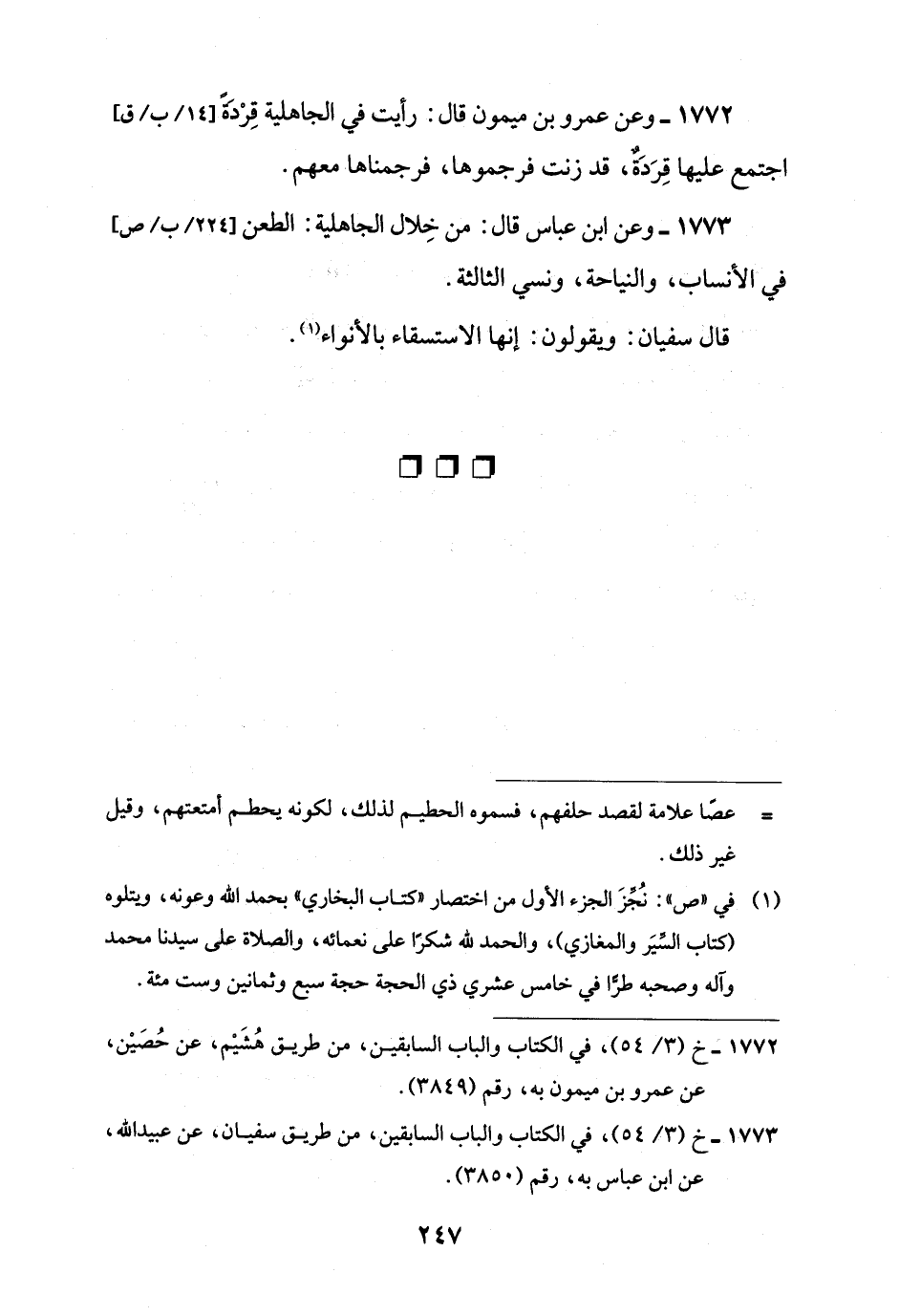 1773 - وعن ابن عباس قال: من خِلال الجاهلية: الطعن في الأنساب، والنياحة، ونسي الثالثة.