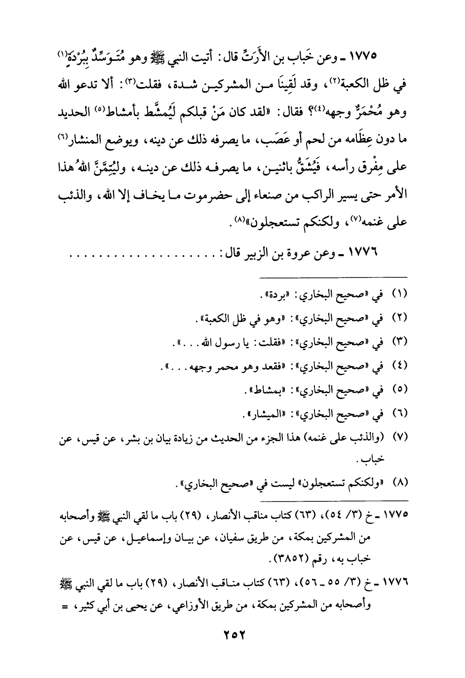 1775 - خ (3/ 54)، (63) كتاب مناقب الأنصار، (29) باب ما لقي النبي -صلى اللَّه عليه وسلم- وأصحابه من المشركين بمكة، من طريق سفيان، عن بيان وإسماعيل، عن قيس، عن خباب به، رقم (3852).