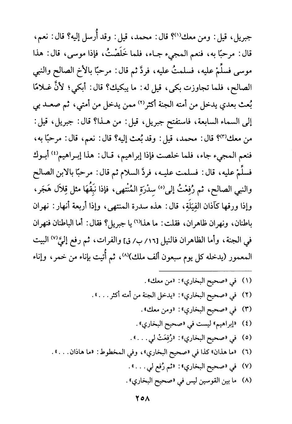 جبريل، قيل: ومن معك (¬1)؟ قال: محمد، قيل: وقد أُرسل إليه؟ قال: نعم، قال: مرحبًا به، فنعم المجيء جاء، فلما خَلَصْتُ، فإذا موسى، قال: هذا موسى فسلِّمْ عليه، فسلمتُ عليه، فردَّ ثم قال: مرحبًا بالأخ الصالح والنبي الصالح، فلما تجاوزت بكى، قيل له: ما يبكيك؟ قال: أبكي؛ لأنَّ غلامًا بُعث بعدي يدخل من أمته الجنة أكثر (¬2) ممن يدخل من أمتي، ثم صعد بي إلى السماء السابعة، فاستفتح جبريل، قيل: من هذا؟ قال: جبريل، قيل: من معك (¬3)؟ قال: محمد، قيل: وقد بُعث إليه؟ قال: نعم، قال: مرحبًا به، فنعم المجيء جاء، فلما خلصت فإذا إبراهيم، قال: هذا إبراهيم (¬4) أبوك فسلِّمْ عليه، قال: فسلمت عليه، فردَّ السلام ثم قال: مرحبًا بالابن الصالح والنبي الصالح، ثم رُفِعْتُ إلى (¬5) سِدْرةِ المُنْتهى، فإذا نبِقُهَا مثل قِلَال هَجَر، وإذا ورقها كآذان الفِيَلَةِ، قال: هذه سدرة المنتهى، وإذا أربعة أنهار: نهران باطنان، ونهران ظاهران، فقلت: ما هذا (¬6) يا جبريل؟ فقال: أما الباطنان فنهران في الجنة، وأما الظاهران فالنيل والفرات، ثم رفع إليَّ (¬7) البيت المعمور (يدخله كل يوم سبعون ألف ملك) (¬8)، ثم أُتيت لإناء من خمر، وإناء