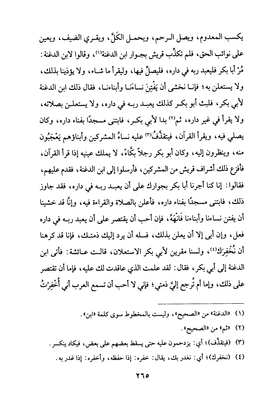 يكسب المعدوم، ويصل الرحم، ويحمل الكَلَّ، ويقري الضيف، ويعين على نوائب الحق، فلم تكذب قريش بجوار ابن الدغنة (¬1)، وقالوا لابن الدغنة: مُرْ أبا بكر فليعبد ربه في داره، فليصلِّ فيها، وليقرأ ما شاء، ولا يؤذينا بذلك، ولا يستعلن به؛ فإنا نخشى أن يَفْتِنَ نساءَنا وأبناءنا، فقال ذلك ابن الدغنة لأبي بكر، فلبث أبو بكر كذلك يعبد ربه في داره، ولا يستعلن بصلاته، ولا يقرأ في غير داره، ثم (¬2) بدا لأبي بكر، فابتنى مسجدًا بفناء داره، وكان يصلِّي فيه، ويقرأ القرآن، فيتقذَّفُ (¬3) عليه نساءُ المشركين وأبناؤهم يَعْجَبُون منه، وينظرون إليه، وكان أبو بكر رجلًا بكَّاءً، لا يملك عينيه إذا قرأ القرآن، فأفزع ذلك أشراف قريش من المشركين، فأرسلوا إلى ابن الدغنة، فقدم عليهم، فقالوا: إنا كنا أجرنا أبا بكر بجوارك على أن يعبد ربه في داره، فقد جاوز ذلك، فابتنى مسجدًا بفناء داره، فأعلن بالصلاة والقراءة فيه، وإنَّا قد خشينا أن يفتن نساءنا وأبناءنا فَانْهَهُ، فإن أحب أن يقتصر على أن يعبد ربه في داره فعل، وإن أبي إلَّا أن يعلن بذلك، فسله أن يرد إليك ذمتك، فإنا قد كرهنا أن نُخْفِرَك (¬4)، ولسنا مقرين لأبي بكر الاستعلان، قالت عائشة: فأتى ابن الدغنة إلى أبي بكر، فقال: لقد علمت الذي عاقدت لك عليه، فإما أن تقتصر على ذلك، وإما أم تُرجع إلي ذمتي؛ فإنّي لا أحب أن تسمع العرب أني أُخْفِرْتُ
