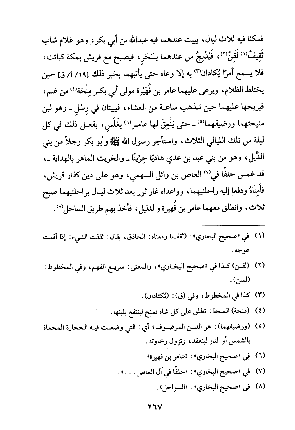 فمكثا فيه ثلاث ليال، يبيت عندهما فيه عبد اللَّه بن أبي بكر، وهو غلام شاب ثَقِيفٌ (¬1) لَقِنٌ (¬2)، فَيُدْلج من عندهما بسَحَرٍ، فيصبح مع قريش بمكة كبائت، فلا يسمع أمرًا يُكادان (¬3) به إلَّا وعاه حتى يأتيهما بخبر ذلك حين يختلط الظلام، ويرعى عليهما عامر بن فُهَيْرة مولى أبي بكر مِنْحَة (¬4) من غنم، فيريحها عليهما حين تذهب ساعة من العشاء، فيبيتان في رِسْلٍ -وهو لبن منيحتهما ورضيفهما (¬5) - حتى يَنْعِقَ لها عامر (¬6) بغَلَسٍ، يفعل ذلك في كل ليلة من تلك الليالي الثلاث، واستأجر رسول اللَّه -صلى اللَّه عليه وسلم- وأبو بكر رجلًا من بني الدِّيل، وهو من بني عبد بن عدي هاديًا خِرِّيتًا -والخريت الماهر بالهداية-، قد غمس حلفًا في (¬7) العاص بن وائل السهمي، وهو على دين كفار قريش، فأَمِنَاهُ ودفعًا إليه راحلتيهما، وواعداه غار ثور بعد ثلاث ليال براحلتيهما صبح ثلاث، وانطلق معهما عامر بن فُهيرة والدليل، فأخذ بهم طريق الساحل (¬8).