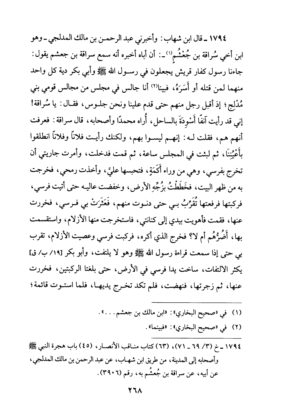 1794 - خ (3/ 69 - 71)، (63) كتاب مناقب الأنصار، (45) باب هجرة النبي -صلى اللَّه عليه وسلم- وأصحابه إلى المدينة، من طريق ابن شهاب، عن عبد الرحمن بن مالك المدلجي، عن أبيه، عن سراقة بن جُعشُم به، رقم (3906).