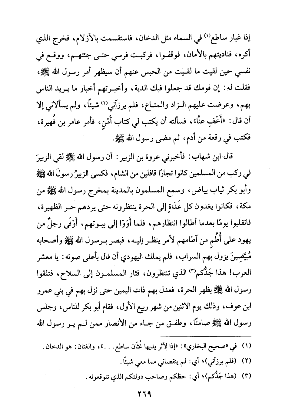 قال ابن شهاب: فأخبرني عروة بن الزبير: أن رسول اللَّه -صلى اللَّه عليه وسلم- لقي الزبيرَ في ركب من المسلمين كانوا تجارًا قافلين من الشام، فكسى الزبيرُ رسولَ اللَّه -صلى اللَّه عليه وسلم- وأبو بكر ثياب بياض، وسمع المسلمون بالمدينة بمخرج رسول اللَّه -صلى اللَّه عليه وسلم- من مكة، فكانوا يغدون كل غَدَاةٍ إلى الحرة ينتظرونه حتى يردهم حر الظهيرة، فانقلبوا يومًا بعدما أطالوا انتظارهم، فلما أوَوْا إلى بيوتهم، أَوْفَى رجلٌ من يهود على أُطُمٍ من آطامهم لأمر ينظر إليه، فبصر برسول اللَّه -صلى اللَّه عليه وسلم- وأصحابه مُبيَّضِينَ يزول بهم السراب، فلم يملك اليهودي أن قال بأعلى صوته: يا معشر العرب! هذا جَدُّكم (¬3) الذي تنتظرون، فثار المسلمون إلى السلاح، فتلقوا رسول اللَّه -صلى اللَّه عليه وسلم- بظهر الحرة، فعدل بهم ذات اليمين حتى نزل بهم في بني عمرو ابن عوف، وذلك يوم الاثنين من شهر ربيع الأول، فقام أبو بكر للنَّاس، وجلس رسول اللَّه -صلى اللَّه عليه وسلم- صامتًا، وطفق من جاء من الأنصار ممن لم يَر رسول اللَّه