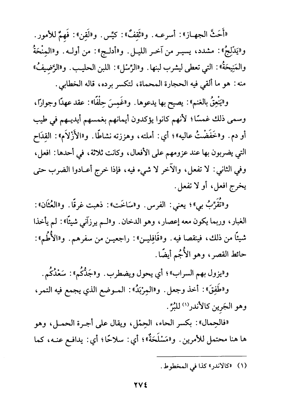 و"يَنْعِقُ بالغنم": يصيح بها يدعوها. و"غَمِسَ حِلْفًا": عقد عهدًا وجوارًا، وسمى ذلك غمسًا؛ لأنهم كانوا يؤكدون أيمانهم بغمسهم أيديهم في طيب أو دم. و"خَفَضْتُ عاليه"؛ أي: أملته، وهززته نشاطًا. و"الأَزْلَام": القِدَاح التي يضربون بها عند عزومهم على الأفعال، وكانت ثلاثة، في أحدها: افعل، وفي الثاني: لا تفعل، والآخر لا شيء فيه، فإذا خرج أعادوا الضرب حتى يخرج افعل، أو لا تفعل.