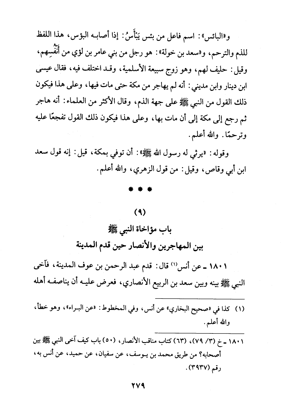 1801 - خ (3/ 79)، (63) كتاب مناقب الأنصار، (50) باب كيف آخى النبي -صلى اللَّه عليه وسلم- بين أصحابه؟ من طريق محمد بن يوسف، عن سفيان، عن حميد، عن أنس به، رقم (3937).