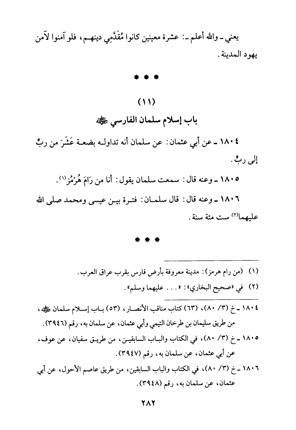 1804 - خ (3/ 80)، (63) كتاب مناقب الأنصار، (53) باب إسلام سلمان -رضي اللَّه عنه-، من طريق سليمان بن طرخان التيمي وأبي عثمان، عن سلمان به، رقم (3946).