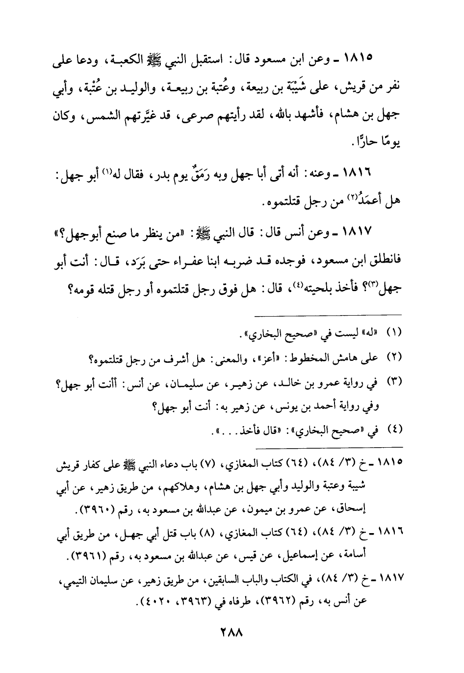 1815 - خ (3/ 84)، (64) كتاب المغازي، (7) باب دعاء النبي -صلى اللَّه عليه وسلم- على كفار قريش شيبة وعتبة والوليد وأبي جهل بن هشام، وهلاكهم، من طريق زهير، عن أبي إسحاق، عن عمرو بن ميمون، عن عبد اللَّه بن مسعود به، رقم (3960).