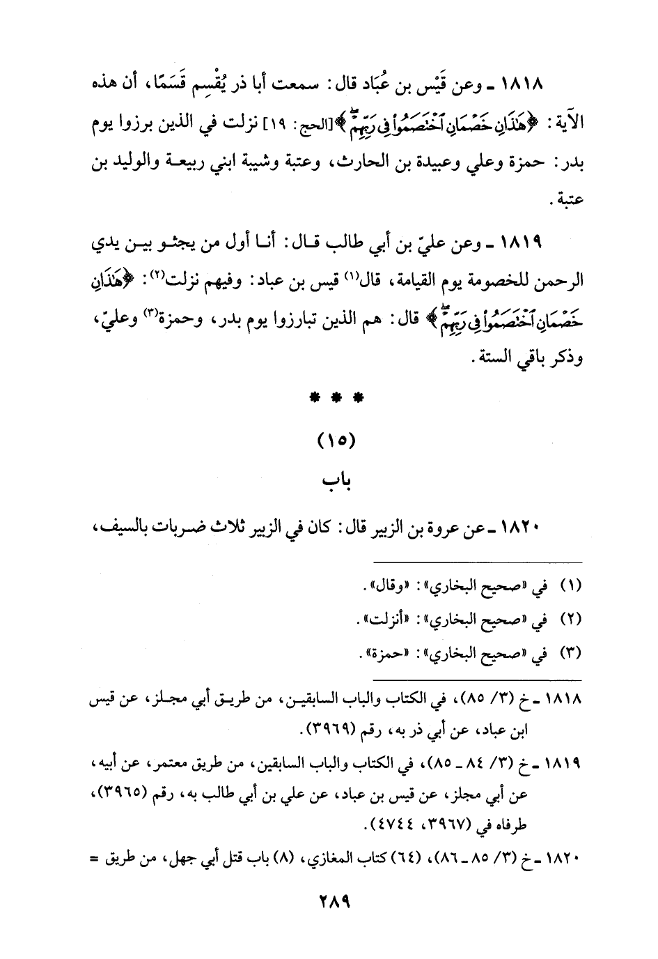1818 - وعن قَيْس بن عُبَاد قال: سمعت أبا ذر يُقْسِم قَسَمًا، أن هذه الآية: {هَذَانِ خَصْمَانِ اخْتَصَمُوا فِي رَبِّهِمْ} [الحج: 19] نزلت في الذين برزوا يوم بدر: حمزة وعلي وعبيدة بن الحارث، وعتبة وشيبة ابني ربيعة والوليد بن عتبة.