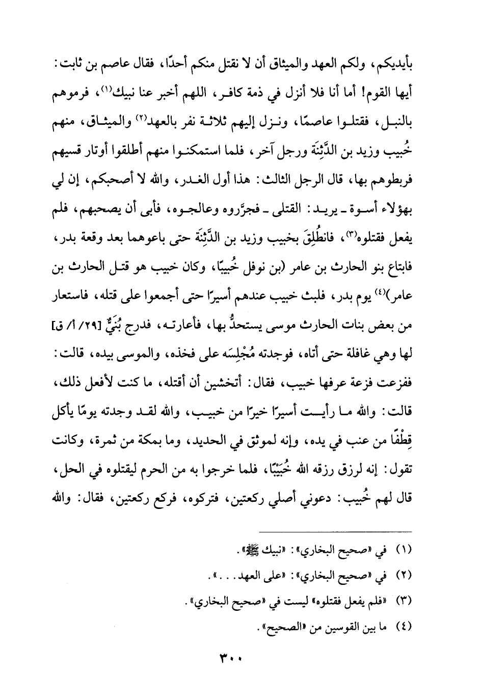 بأيديكم، ولكم العهد والميثاق أن لا نقتل منكم أحدًا، فقال عاصم بن ثابت: أيها القوم! أمَّا أنا فلا أنزل في ذمة كافر، اللَّهم أخبر عنا نبيك (¬1)، فرموهم بالنبل، فقتلوا عاصمًا، ونزل إليهم ثلاثة نفر بالعهد (¬2) والميثاق، منهم خُبيب يزيد بن الدَّثِنَة ورجل آخر، فلما استمكنوا منهم أطلقوا أوتار قسيهم فربطوهم بها، قال الرجل الثالث: هذا أول الغدر، واللَّه لا أصحبكم، إن لي بهؤلاء أسوة -يريد: القتلى- فجرَّروه وعالجوه، فأبى أن يصحبهم، فلم يفعل فقتلوه (¬3)، فانطُلِقَ بخبيب يزيد بن الدَّثِنَة حتى باعوهما بعد وقعة بدر، فابتاع بنو الحارث بن عامر (بن نوفل خُبيبًا، وكان حبيب هو قتل الحارث بن عامر) (¬4) يوم بدر، فلبث حبيب عندهم أسيرًا حتى أجمعوا على قتله، فاستعار من بعض بنات الحارث موسى يستحدُّ بها، فأعارته، فدرج بُنَيٌّ لها وهي غافلة حتى أتاه، فوجدته مُجْلِسَه على فخذه، والموسى بيده، قالت: ففزعت فزعة عرفها حبيب، فقال: أتخشين أن أقتله، ما كنت لأفعل ذلك، قالت: واللَّه ما رأيت أسيرًا خيرًا من حبيب، واللَّه لقد وجدته يومًا يأكل قِطْفًا من عنب في يده، وإنه لموثق في الحديد، وما بمكة من ثمرة، وكانت تقول: إنَّه لرزق رزقه اللَّه خُبَيْبًا، فلما خرجوا به من الحرم ليقتلوه في الحل، قال لهم خُبيب: دعوني أصلي ركعتين، فتركوه، فركع ركعتين، فقال: واللَّه