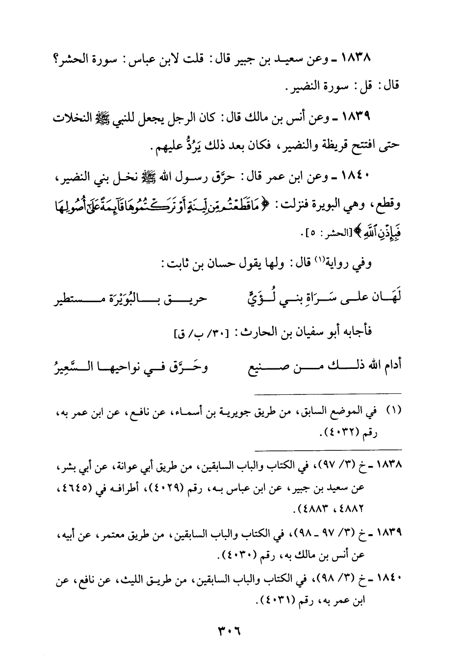 1840 - وعن ابن عمر قال: حرَّق رسول اللَّه -صلى اللَّه عليه وسلم- نخل بني النضير، وقطع، وهي البويرة فنزلت: {مَا قَطَعْتُمْ مِنْ لِينَةٍ أَوْ تَرَكْتُمُوهَا قَائِمَةً عَلَى أُصُولِهَا فَبِإِذْنِ اللَّهِ} [الحشر: 5].
