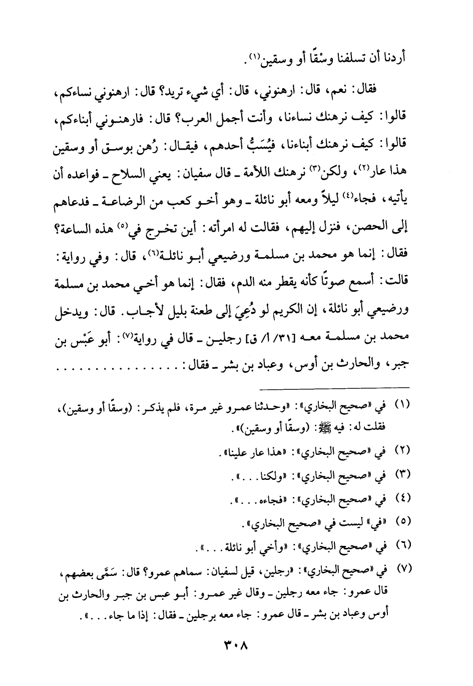 فقال: نعم، قال: ارهنوني، قال: أي شيء تريد؟ قال: ارهنوني نساءكم، قالوا: كيف نرهنك نساءنا، وأنت أجمل العرب؟ قال: فارهنوني أبناءكم، قالوا: كيف نرهنك أبناءنا، فيُسَبُّ أحدهم، فيقال: رُهن بوسق أو وسقين هذا عار (¬2)، ولكن (¬3) نرهنك اللأمة -قال سفيان: يعني السلاح- فواعده أن يأتيه، فجاء (¬4) ليلًا ومعه أبو نائلة -وهو أخو كعب من الرضاعة- فدعاهم إلى الحصن، فنزل إليهم، فقالت له امرأته: أين تخرج في (¬5) هذه الساعة؟ فقال: إنما هو محمد بن مسلمة ورضيعي أبو نائلة (¬6)، قال: وفي رواية: قالت: أسمع صوتًا كأنه يقطر منه الدم، فقال: إنما هو أخي محمد بن مسلمة ورضيعي أبو نائلة، إن الكريم لو دُعِيَ إلى طعنة بليل لأجاب. قال: ويدخل محمد بن مسلمة معه رجلين -قال في رواية (¬7): أبو عَبْس بن جبر، والحارث بن أوس، وعباد بن بشر- فقال: . . . .