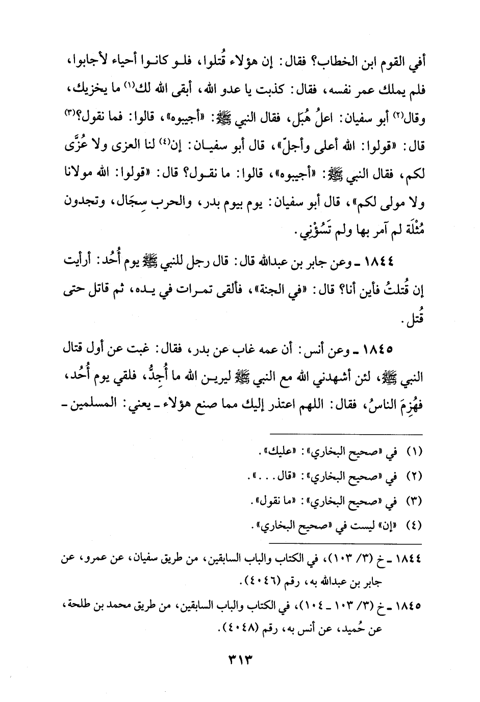 1845 - وعن أَنس: أن عمه غاب عن بدر، فقال: غبت عن أول قتال النبي -صلى اللَّه عليه وسلم-، لئن أشهدني اللَّه مع النبي -صلى اللَّه عليه وسلم- ليرين اللَّه ما أُجِدُّ، فلقي يوم أُحُد، فهُزِمَ الناسُ، فقال: اللهم اعتذر إليك مما صنع هؤلاء -يعني: المسلمين-