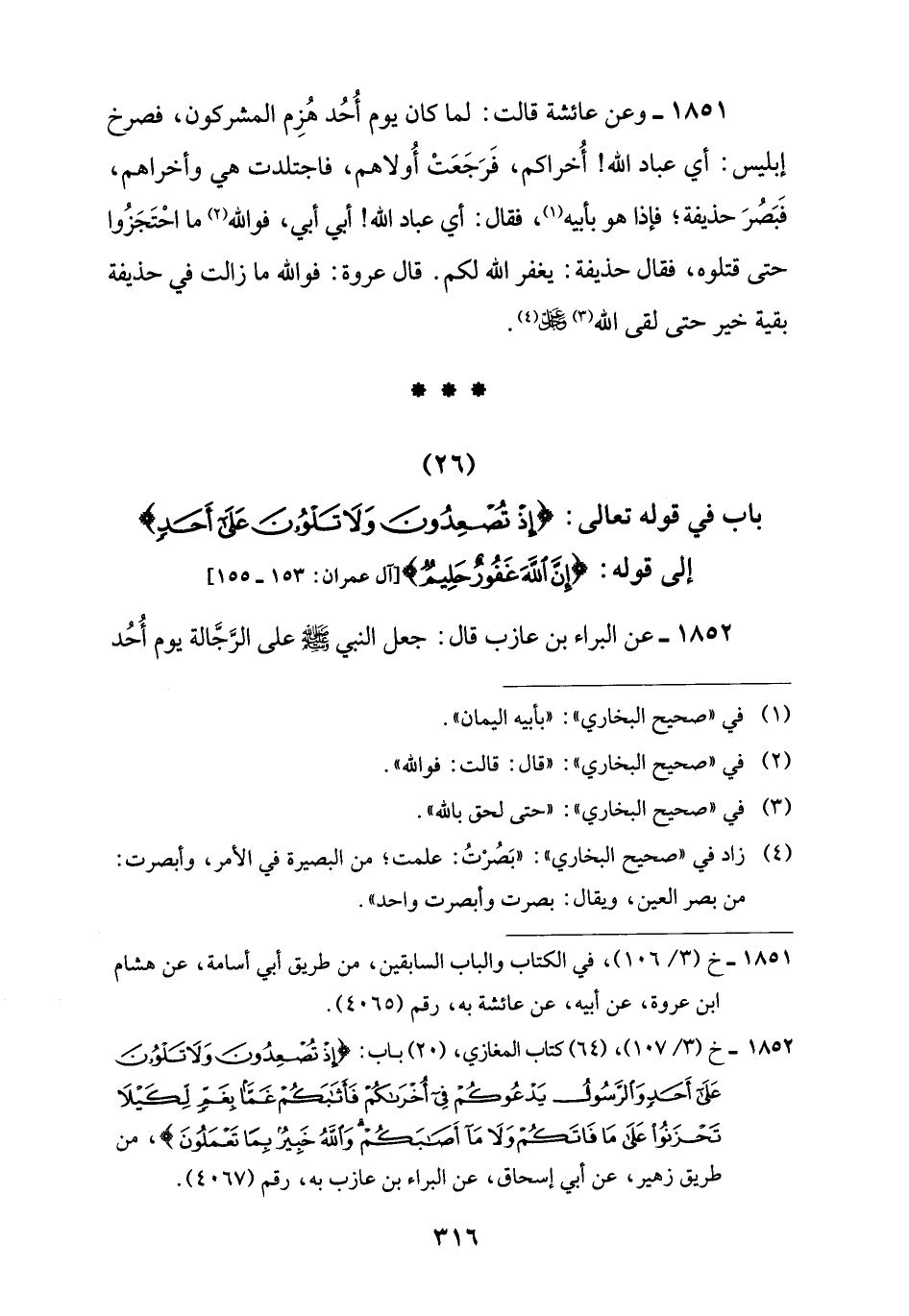 1852 - خ (3/ 107)، (64) كتاب المغازي، (20) باب: {إِذْ تُصْعِدُونَ وَلَا تَلْوُونَ عَلَى أَحَدٍ وَالرَّسُولُ يَدْعُوكُمْ فِي أُخْرَاكُمْ فَأَثَابَكُمْ غَمًّا بِغَمٍّ لِكَيْلَا تَحْزَنُوا عَلَى مَا فَاتَكُمْ وَلَا مَا أَصَابَكُمْ وَاللَّهُ خَبِيرٌ بِمَا تَعْمَلُونَ}، من طريق زهير، عن أبي إسحاق، عن البراء بن عازب به، رقم (4067).