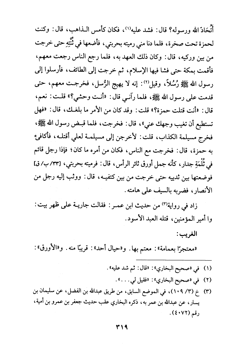 أَتُحَادّ اللَّه ورسوله؟ قال: فشد عليه (¬1)، فكان كأمس الذاهب، قال: وكنت لحمزة تحت صخرة، فلما دنا مني رميته بحربتي، فأضعها في ثُنَّتِهِ حتى خرجت من بين وركيه، قال: وكان ذلك العهد به، فلما رجع الناس رجعت معهم، فأقمت بمكة حتى فشا فيها الإسلام، ثم خرجت إلى الطائف، فأرسلوا إلى رسول اللَّه -صلى اللَّه عليه وسلم- رُسُلًا، وقيل (¬2): إنه لا يهيج الرُّسل، فخرجت معهم، حتى قدمت على رسول اللَّه -صلى اللَّه عليه وسلم-، فلما رآني قال: "أنت وحشي؟ " قلت: نعم، قال: "أنت قتلت حمزة؟ " قلت: وقد كان من الأمر ما بلغك، قال: "فهل تستطيع أن تغيب وجهك عني"، قال: فخرجت، فلما قبض رسول اللَّه -صلى اللَّه عليه وسلم-، فخرج مسيلمة الكذاب، قلت: لأخرجن إلى مسيلمة لعلي أقتله، فأكافئ به حمزة، قال: فخرجت مع الناس، فكان من أمره ما كان؛ فإذا رجل قائم في ثُلْمَةِ جدار، كأنه جمل أورق ثائر الرأس، قال: فرميته بحربتي، فوضعتها بين ثدييه حتى خرجت من بين كتفيه، قال: ووثب إليه رجل من الأنصار، فضربه بالسيف على هامته.