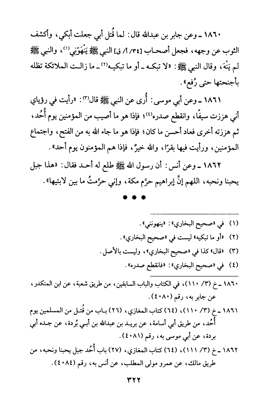 1861 - خ (3/ 110)، (64) كتاب المغازي، (26) باب من قُتل من المسلمين يوم أُحُد، من طريق أبي أسامة، عن بريد بن عبد اللَّه بن أبي بُردة، عن جده أبي بردة، عن أبي موسى به، رقم (4081).