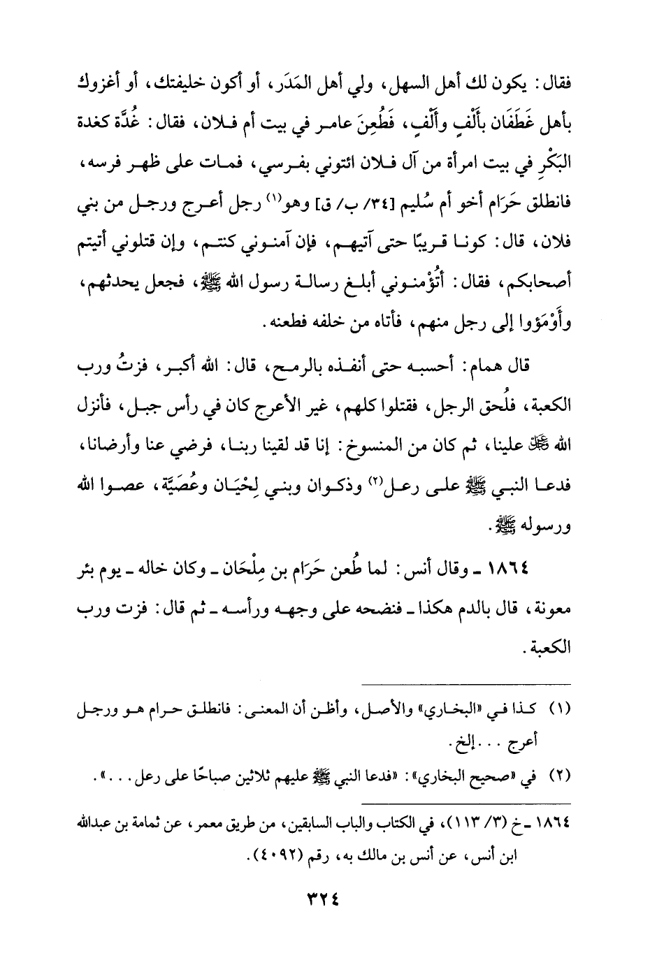 1864 - وقال أَنس: لما طُعن حَرَام بن مِلْحَان -وكان خاله- يوم بئر معونة، قال بالدم هكذا -فنضحه على وجهه ورأسه- ثم قال: فزت ورب الكعبة.