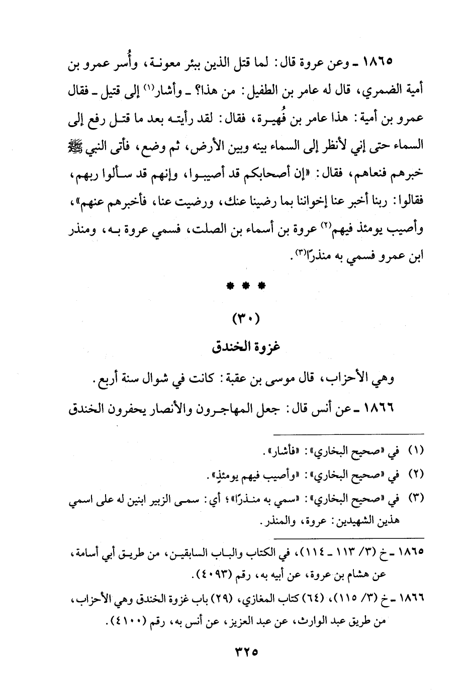 1865 - وعن عروة قال: لما قتل الذين ببئر معونة، وأُسر عمرو بن أمية الضمري، قال له عامر بن الطفيل: من هذا؟ -وأشار (¬1) إلى قتيل- فقال عمرو بن أمية: هذا عامر بن فُهيرة، فقال: لقد رأيته بعد ما قتل رفع إلى السماء حتى إني لأنظر إلى السماء بينه وبين الأرض، ثم وضع، فأتى النبي -صلى اللَّه عليه وسلم- خبرهم فنعاهم، فقال: "إن أصحابكم قد أصيبوا، وإنهم قد سألوا ربهم، فقالوا: ربنا أخبر عنا إخواننا بما رضينا عنك، ورضيت عنا، فأخبرهم عنهم"، وأصيب يومئذ فيهم (¬2) عروة بن أسماء بن الصلت، فسمي عروة به، ومنذر ابن عمرو فسمي به منذرًا (¬3).