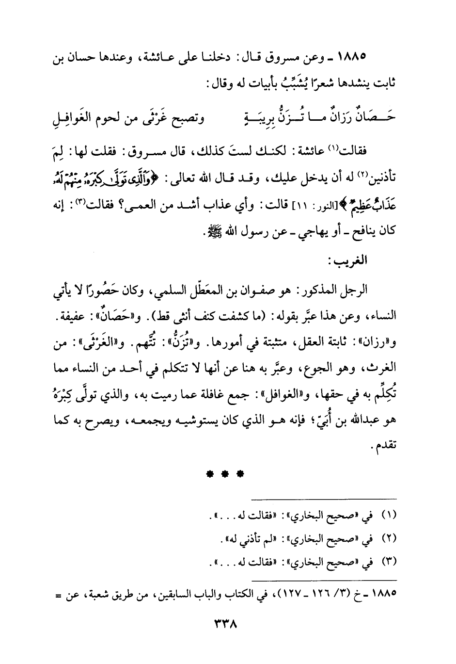 1885 - وعن مسروق قال: دخلنا على عائشة، وعندها حسان بن ثابت ينشدها شعرًا يُشَبِّبُ بأبيات له وقال: