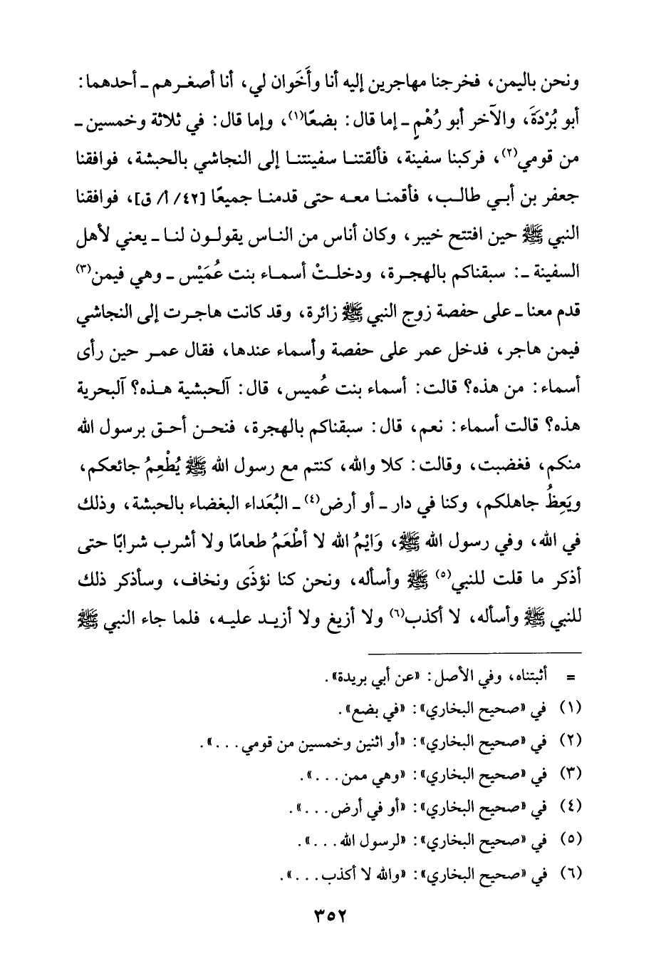ونحن باليمن، فخرجنا مهاجرين إليه أنا وأَخَوان لي، أنا أصغرهم -أحدهما: أَبو بُرْدَةَ، والآخر أَبو رُهْمِ- إما قال: بضعًا (¬1)، وإما قال: في ثلاثة وخمسين- من قومي (¬2)، فركبنا سفينة، فألقتنا سفينتنا إلى النجاشي بالحبشة، فوافقنا جعفر بن أبي طالب، فأقمنا معه حتى قدمنا جميعًا فوافقنا النبي -صلى اللَّه عليه وسلم- حين افتتح خيبر، وكان أناس من الناس يقولون لنا -يعني لأهل السفينة-: سبقناكم بالهجرة، ودخلتْ أسماء بنت عُمَيْس -وهي فيمن (¬3) قدم معنا- على حفصة زوج النبي -صلى اللَّه عليه وسلم- زائرة، وقد كانت هاجرت إلى النجاشي فيمن هاجر، فدخل عمر على حفصة وأسماء عندها، فقال عمر حين رأى أسماء: من هذه؟ قالت: أسماء بنت عُميس، قال: آلحبشية هذه؟ آلبحرية هذه؟ قالت أسماء: نعم، قال: سبقناكم بالهجرة، فنحن أحق برسول اللَّه منكم، فغضبت، وقالت: كلا واللَّه، كنتم مع رسول اللَّه -صلى اللَّه عليه وسلم- يُطْعِمُ جائعكم، ويَعِظُ جاهلكم، وكنا في دار -أو أرض (¬4) - البُعَداء البغضاء بالحبشة، وذلك في اللَّه، وفي رسول اللَّه -صلى اللَّه عليه وسلم-، وَايْمُ اللَّه لا أطْعَمُ طعامًا ولا أشرب شرابًا حتى أذكر ما قلت للنبي (¬5) -صلى اللَّه عليه وسلم- وأساله، ونحن كنا نؤذَى ونخاف، وسأذكر ذلك للنبي -صلى اللَّه عليه وسلم- وأساله، لا أكذب (¬6) ولا أزيغ ولا أزيد عليه، فلما جاء النبي -صلى اللَّه عليه وسلم-