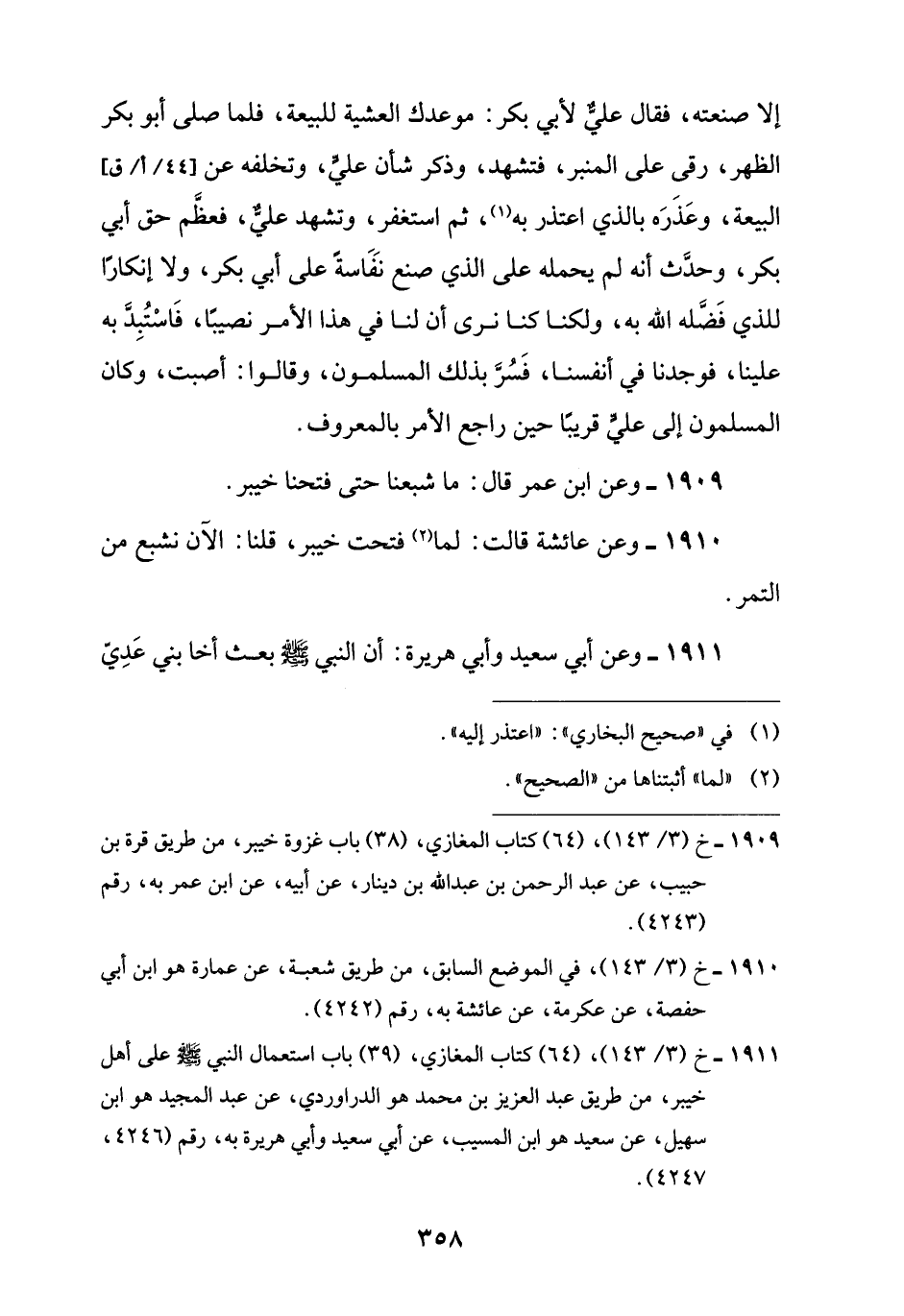 1911 - خ (3/ 143)، (64) كتاب المغازي، (39) باب استعمال النبي -صلى اللَّه عليه وسلم- على أهل خيبر، من طريق عبد العزيز بن محمد هو الدراوردي، عن عبد المجيد هو ابن سهيل، عن سعيد هو ابن المسيب، عن أبي سعيد وأبي هريرة به، رقم (4246، 4247).