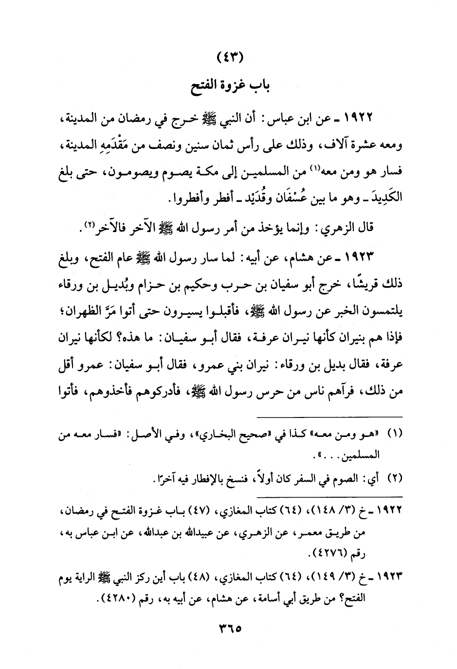1923 - عن هشام، عن أبيه: لما سار رسول اللَّه -صلى اللَّه عليه وسلم- عام الفتح، وبلغ ذلك قريشًا، خرج أَبو سفيان بن حرب وحكيم بن حزام وبُديل بن ورقاء يلتمسون الخبر عن رسول اللَّه -صلى اللَّه عليه وسلم-، فأقبلوا يسيرون حتى أتوا مَرَّ الظهران؛ فإذا هم بنيران كأنها نيران عرفة، فقال أَبو سفيان: ما هذه؟ لكأنها نيران عرفة، فقال بديل بن ورقاء: نيران بني عمرو، فقال أَبو سفيان: عمرو أقل من ذلك، فرآهم ناس من حرس رسول اللَّه -صلى اللَّه عليه وسلم-، فأدركوهم فأخذوهم، فأتوا