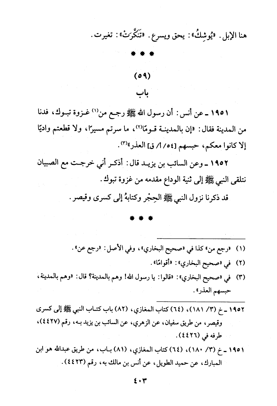 1951 - عن أَنس: أن رسول اللَّه -صلى اللَّه عليه وسلم- رجع من (¬1) غزوة تبوك، فدنا من المدينة فقال: "إن بالمدينة قومًا (¬2)، ما سرتم مسيرًا، ولا قطعتم واديًا إلَّا كانوا معكم، حبسهم العذر" (¬3).