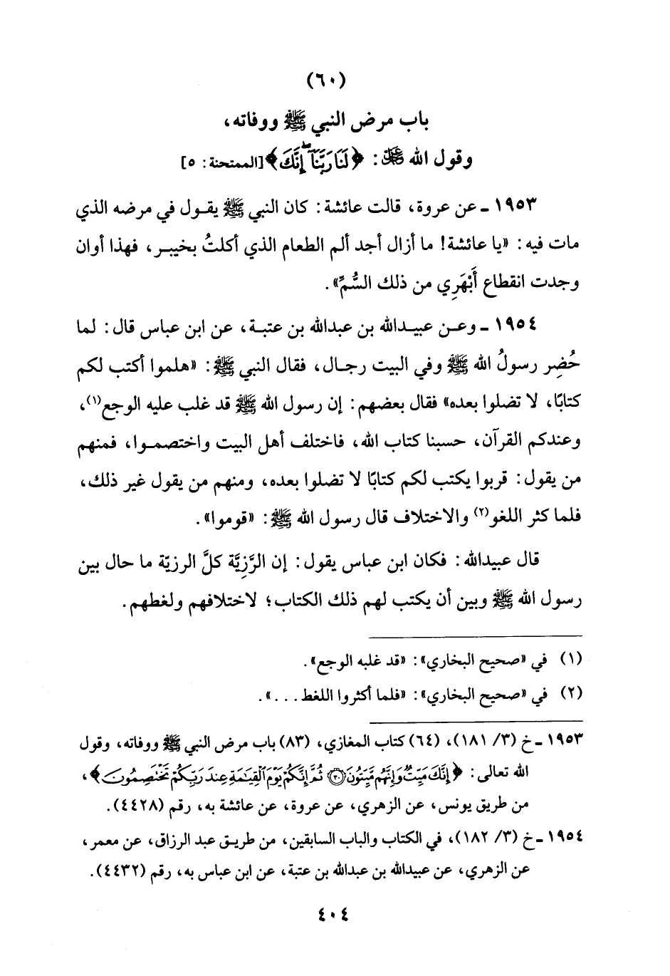 1954 - وعن عبيد اللَّه بن عبد اللَّه بن عتبة، عن ابن عباس قال: لما حُضِر رسولُ اللَّه -صلى اللَّه عليه وسلم- وفي البيت رجال، فقال النبي -صلى اللَّه عليه وسلم-: "هلموا أكتب لكم كتابًا، لا تضلوا بعده" فقال بعضهم: إن رسول اللَّه -صلى اللَّه عليه وسلم- قد غلب عليه الوجع (¬1)، وعندكم القرآن، حسبنا كتاب اللَّه، فاختلف أهل البيت واختصموا، فمنهم من يقول: قربوا يكتب لكم كتابًا لا تضلوا بعده، ومنهم من يقول غير ذلك، فلما كثر اللغو (¬2) والاختلاف قال رسول اللَّه -صلى اللَّه عليه وسلم-: "قوموا".
