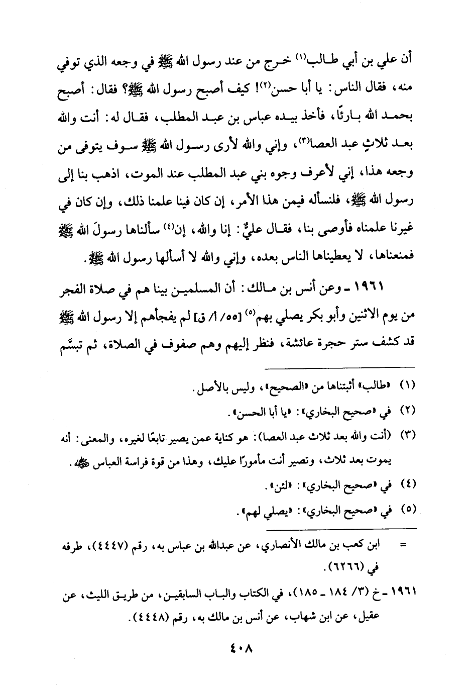 أن علي بن أبي طالب (¬1) خرج من عند رسول اللَّه -صلى اللَّه عليه وسلم- في وجعه الذي توفي منه، فقال الناس: يا أبا حسن (¬2)! كيف أصبح رسول اللَّه -صلى اللَّه عليه وسلم-؟ فقال: أصبح بحمد اللَّه بارئًا، فأخذ بيده عباس بن عبد المطلب، فقال له: أنت واللَّه بعد ثلاثٍ عبد العصا (¬3)، وإني واللَّه لأرى رسول اللَّه -صلى اللَّه عليه وسلم- سوف يتوفى من وجعه هذا، إني لأعرف وجوه بني عبد المطلب عند الموت، اذهب بنا إلى رسول اللَّه -صلى اللَّه عليه وسلم-، فلنسأله فيمن هذا الأمر، إن كان فينا علمنا ذلك، وإن كان في غيرنا علمناه فأوصى بنا، فقال عليٌّ: إنا واللَّه، إن (¬4) سألناها رسولَ اللَّه -صلى اللَّه عليه وسلم- فمنعناها، لا يعطيناها الناس بعده، وإني واللَّه لا أسألها رسول اللَّه -صلى اللَّه عليه وسلم-.