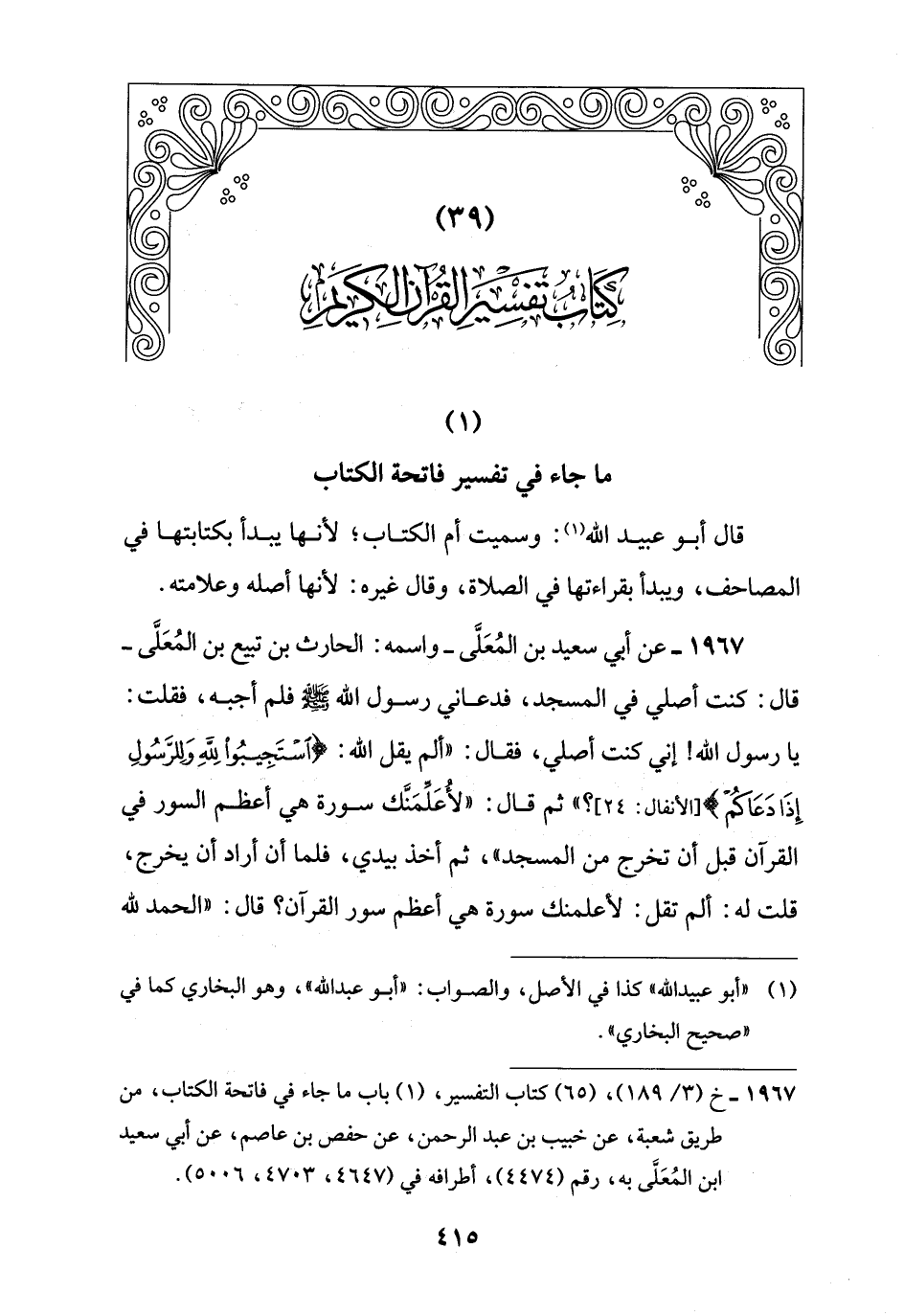 1967 - خ (3/ 189)، (65) كتاب التفسير، (1) باب ما جاء في فاتحة الكتاب، من طريق شعبة، عن خبيب بن عبد الرحمن، عن حفص بن عاصم، عن أبي سعيد ابن المُعَلَّى به، رقم (4474)، أطرافه في (4647، 4703، 5006).