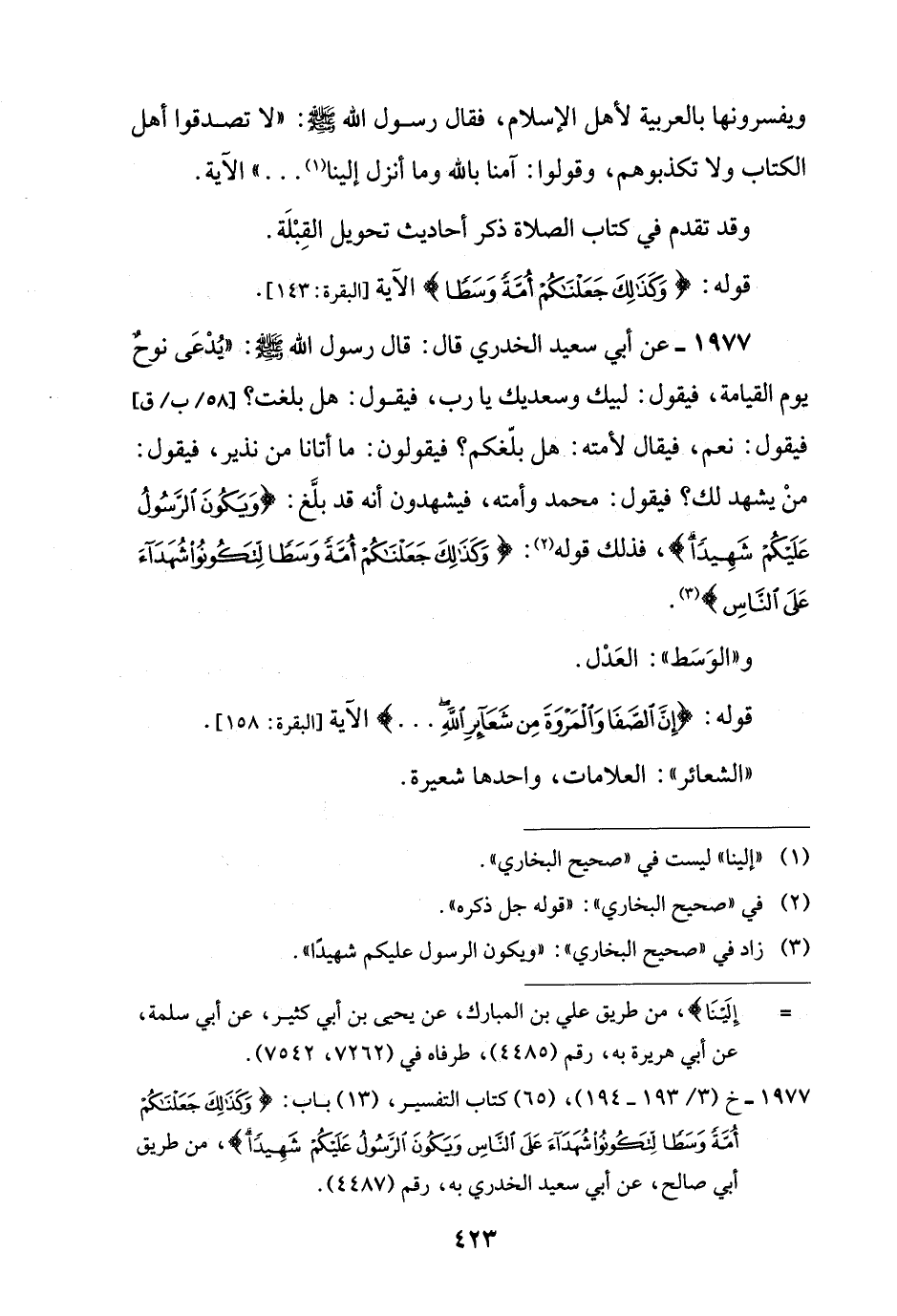 1977 - خ (3/ 193 - 194)، (65) كتاب التفسير، (13) باب: {وَكَذَلِكَ جَعَلْنَاكُمْ أُمَّةً وَسَطًا لِتَكُونُوا شُهَدَاءَ عَلَى النَّاسِ وَيَكُونَ الرَّسُولُ عَلَيْكُمْ شَهِيدًا}، من طريق أبي صالح، عن أبي سعيد الخدري به، رقم (4487).