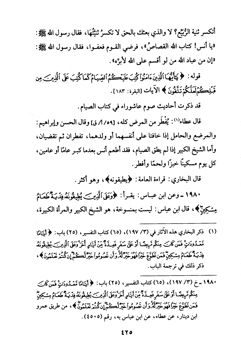 1980 - وعن ابن عباس: يقرأ: {وَعَلَى الَّذِينَ يُطِيقُونَهُ فِدْيَةٌ طَعَامُ مِسْكِينٍ}، قال ابن عباس: ليست بمنسوخة، هو الشيخ الكبير والمرأة الكبيرة،