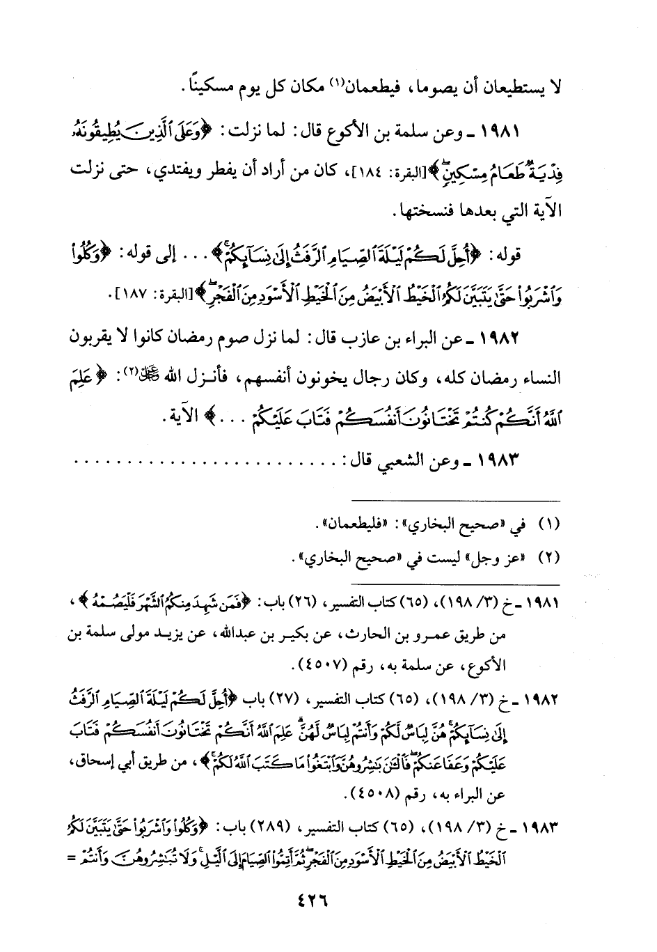 1981 - وعن سلمة بن الأكوع قال: لما نزلت: {وَعَلَى الَّذِينَ يُطِيقُونَهُ فِدْيَةٌ طَعَامُ مِسْكِينٍ} [البقرة: 184]، كان من أراد أن يفطر ويفتدي، حتى نزلت الآية التي بعدها فنسختها.