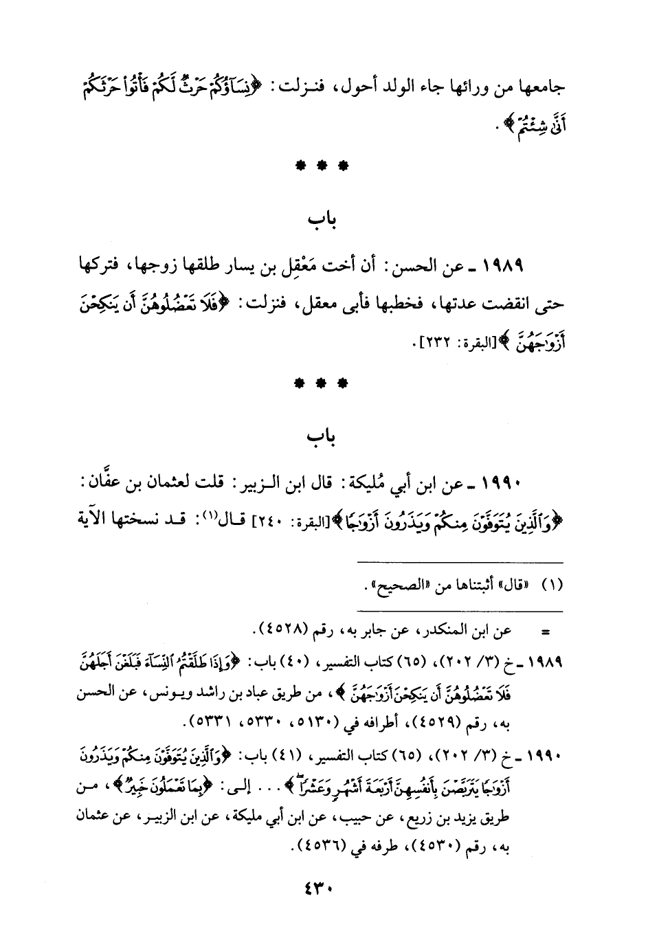 1990 - خ (3/ 202)، (65) كتاب التفسير، (41) باب: {وَالَّذِينَ يُتَوَفَّوْنَ مِنْكُمْ وَيَذَرُونَ أَزْوَاجًا يَتَرَبَّصْنَ بِأَنْفُسِهِنَّ أَرْبَعَةَ أَشْهُرٍ وَعَشْرًا}. . . إلى: {بِمَا تَعْمَلُونَ خَبِيرٌ}، من طريق يزيد بن زريع، عن حبيب، عن ابن أبي مليكة، عن ابن الزبير، عن عثمان به، رقم (4530)، طرفه في (4536).
