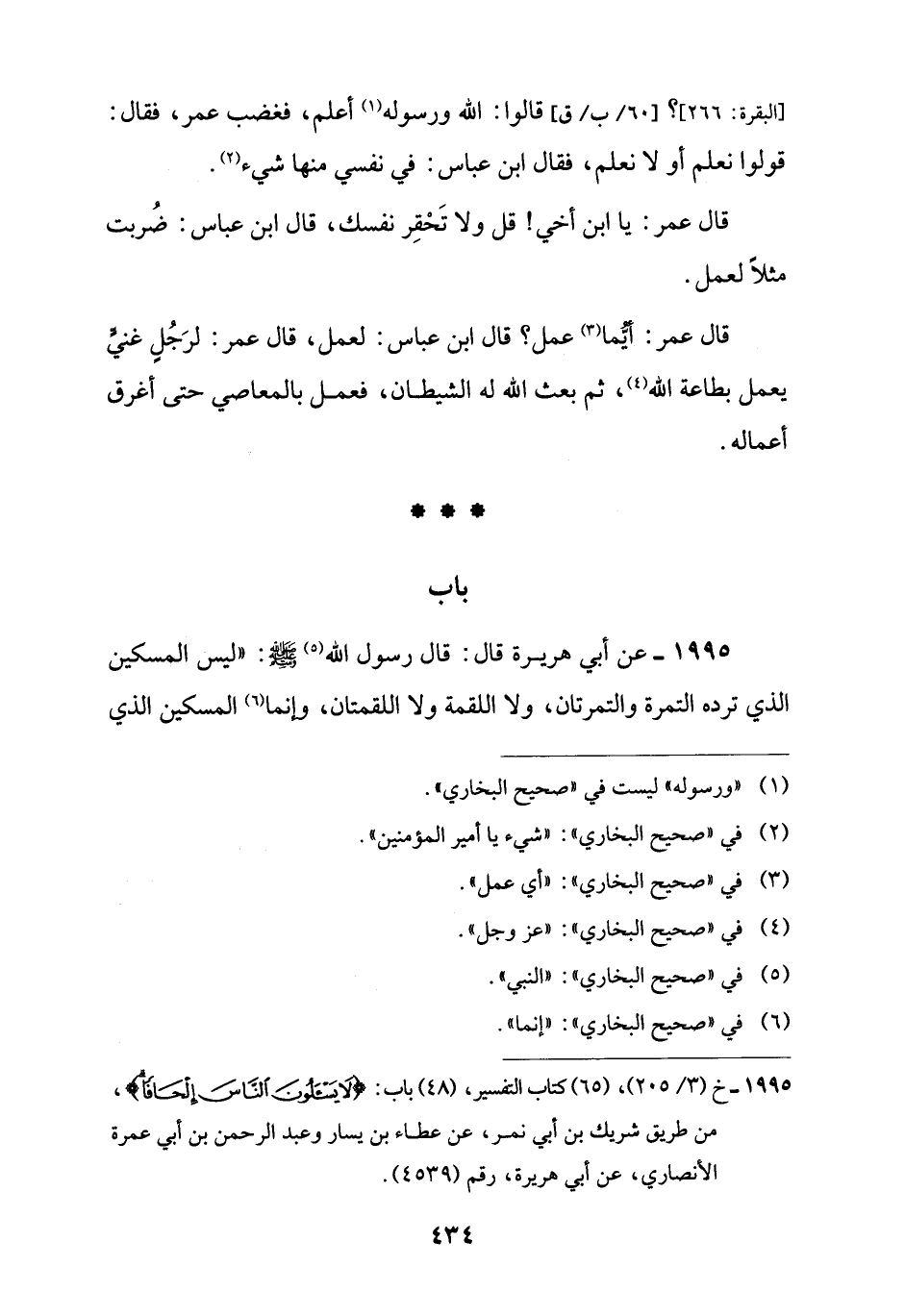 1995 - خ (3/ 205)، (65) كتاب التفسير، (48) باب: {لَا يَسْأَلُونَ النَّاسَ إِلْحَافًا}، من طريق شريك بن أبي نمر، عن عطاء بن يسار وعبد الرحمن بن أبي عمرة الأنصاري، عن أبي هريرة، رقم (4539).