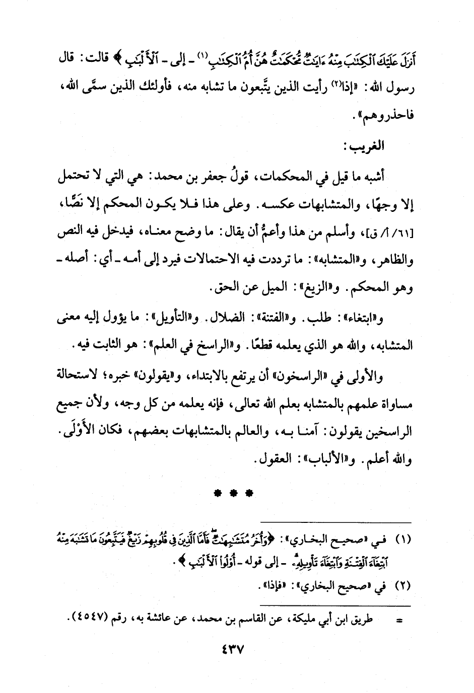 (¬1) في "صحيح البخاري": {وَأُخَرُ مُتَشَابِهَاتٌ فَأَمَّا الَّذِينَ فِي قُلُوبِهِمْ زَيْغٌ فَيَتَّبِعُونَ مَا تَشَابَهَ مِنْهُ ابْتِغَاءَ الْفِتْنَةِ وَابْتِغَاءَ تَأْوِيلِهِ -إلى- أُولُو الْأَلْبَابِ} ".